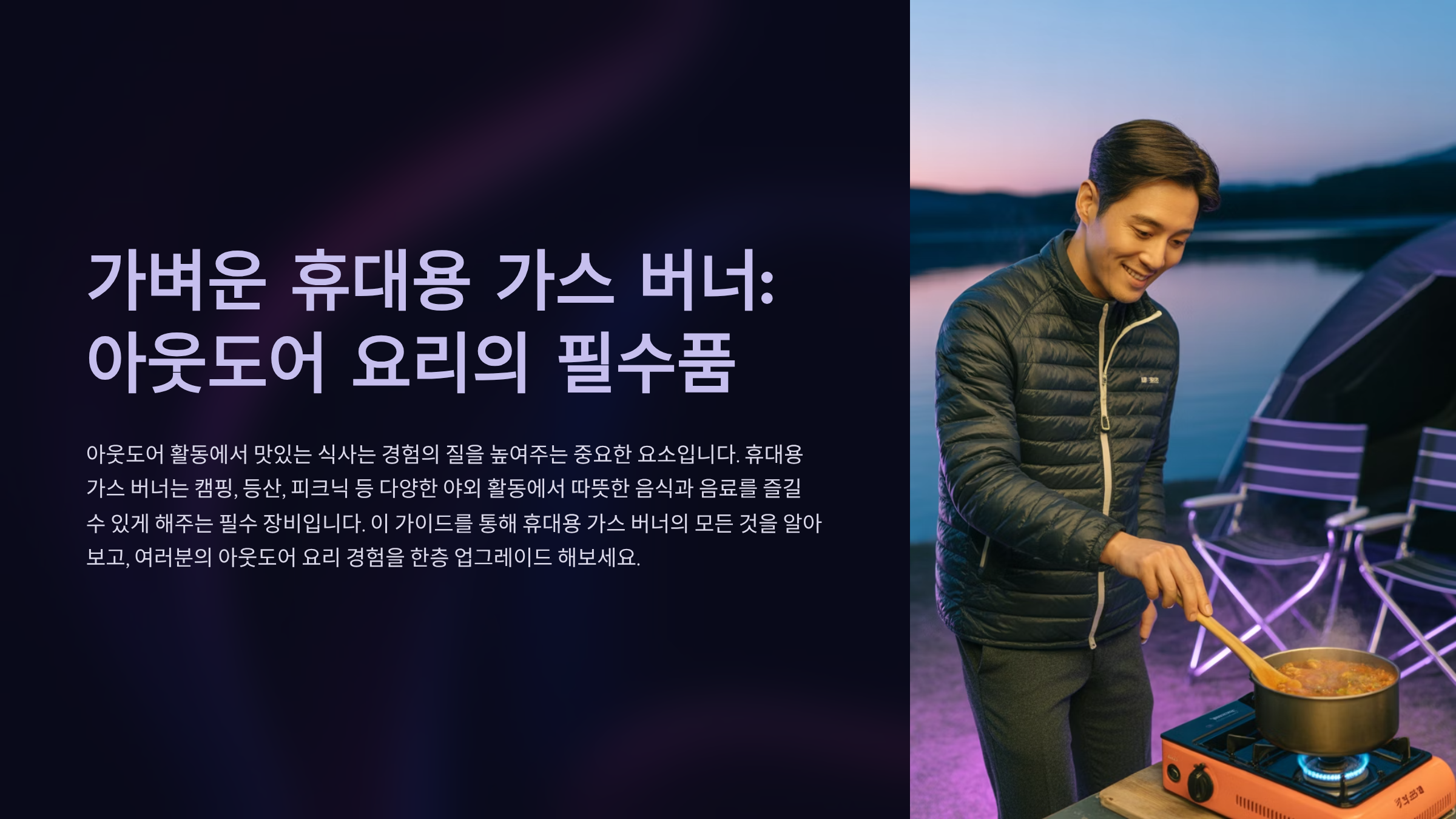 캠핑, 등산, 낚시, 백패킹 등 아웃도어 활동을 즐기는 분들에게 **휴대용 가스 버너**는 빼놓을 수 없는 필수품입니다. 끓는 물 한 잔의 커피부터 뜨끈한 라면, 근사한 야외 요리까지, 휴대용 버너 하나면 어디든 나만의 주방이 됩니다. 하지만 시중에 너무나도 다양한 종류의 버너가 나와 있어 어떤 것을 골라야 할지 막막할 때가 많습니다.
