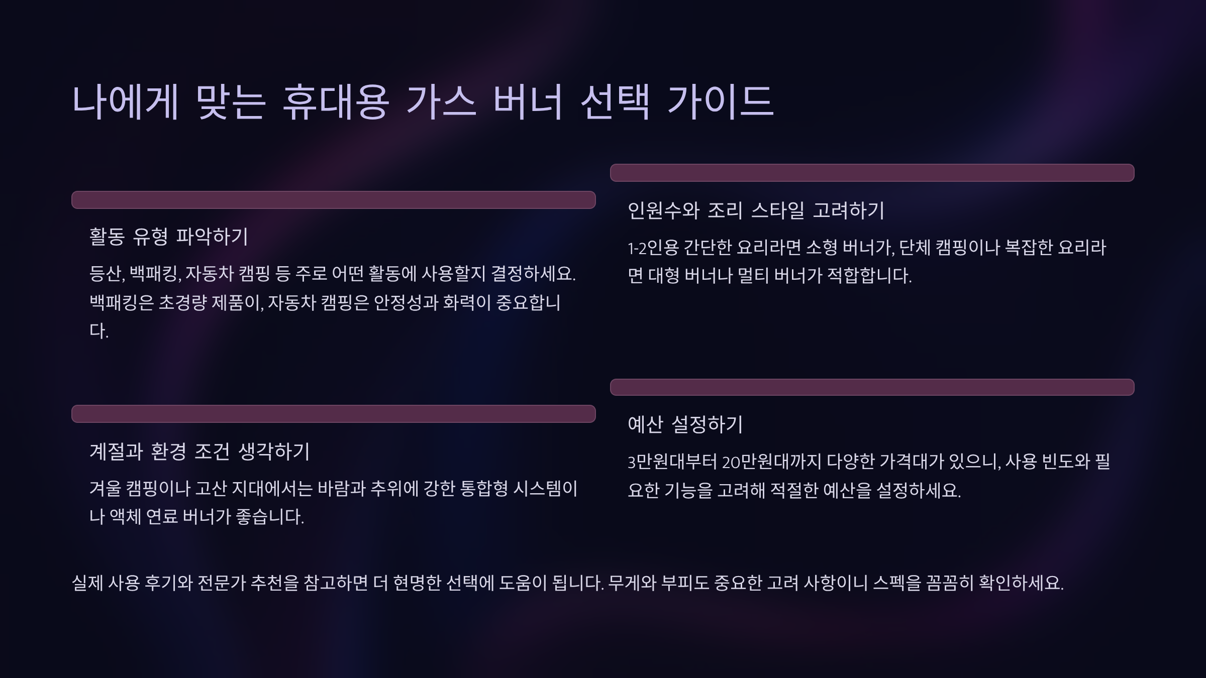 | 용도 및 활동 | 등산, 백패킹, 캠핑, 낚시, 차박 등 | 무게/부피 vs 화력/안정성 중 우선순위 결정 |