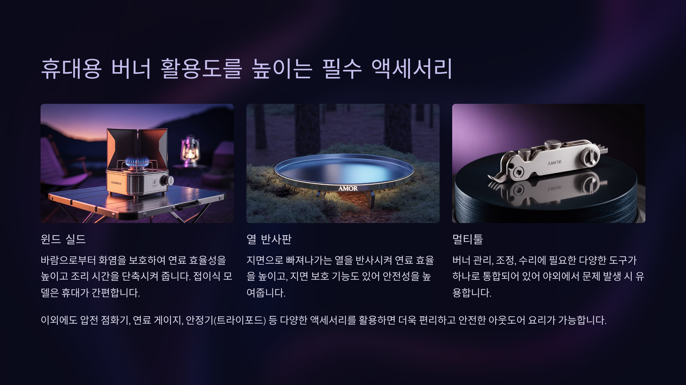 | 바람막이 | 바람으로 인한 화력 손실 방지, 연비 향상 | 버너 사이즈에 맞는 높이와 길이 선택 |