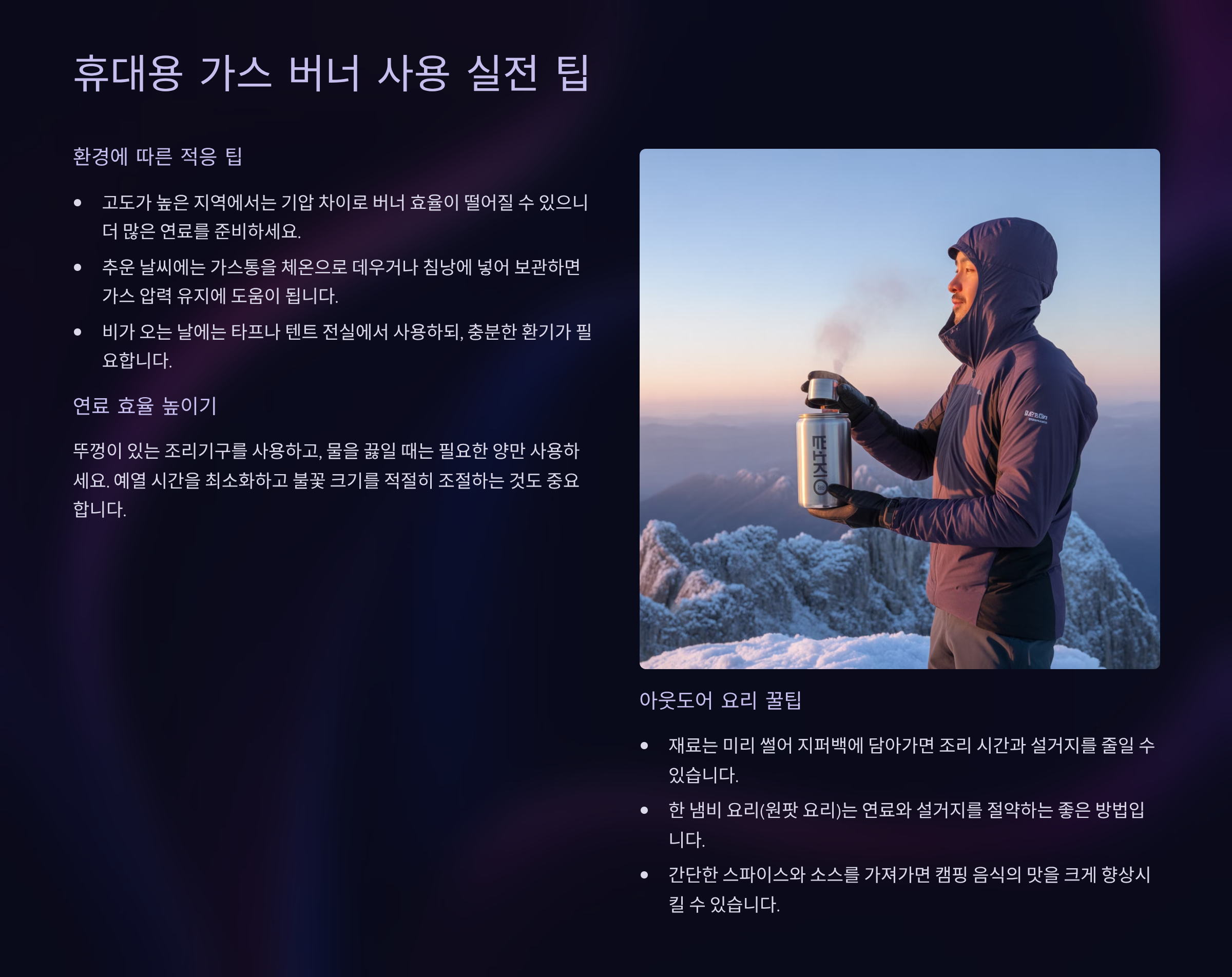 | 겨울철 사용 | 이소부탄/프로판 가스 사용, 가스 워머/뜨거운 물 활용 | 낮은 온도에서도 안정적인 화력 유지 |