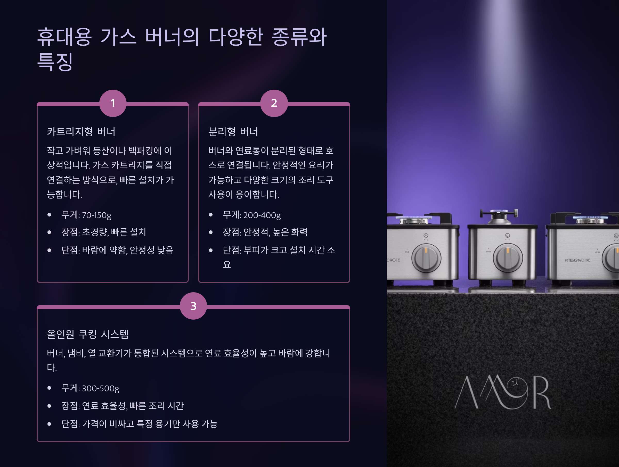 | 일체형 버너 | 버너 헤드가 가스통에 직접 연결 | 매우 가볍고 작음, 휴대성 최고 | 안정성 취약, 큰 용기 사용 어려움 | 등산, 솔로 백패킹, 비상용 |