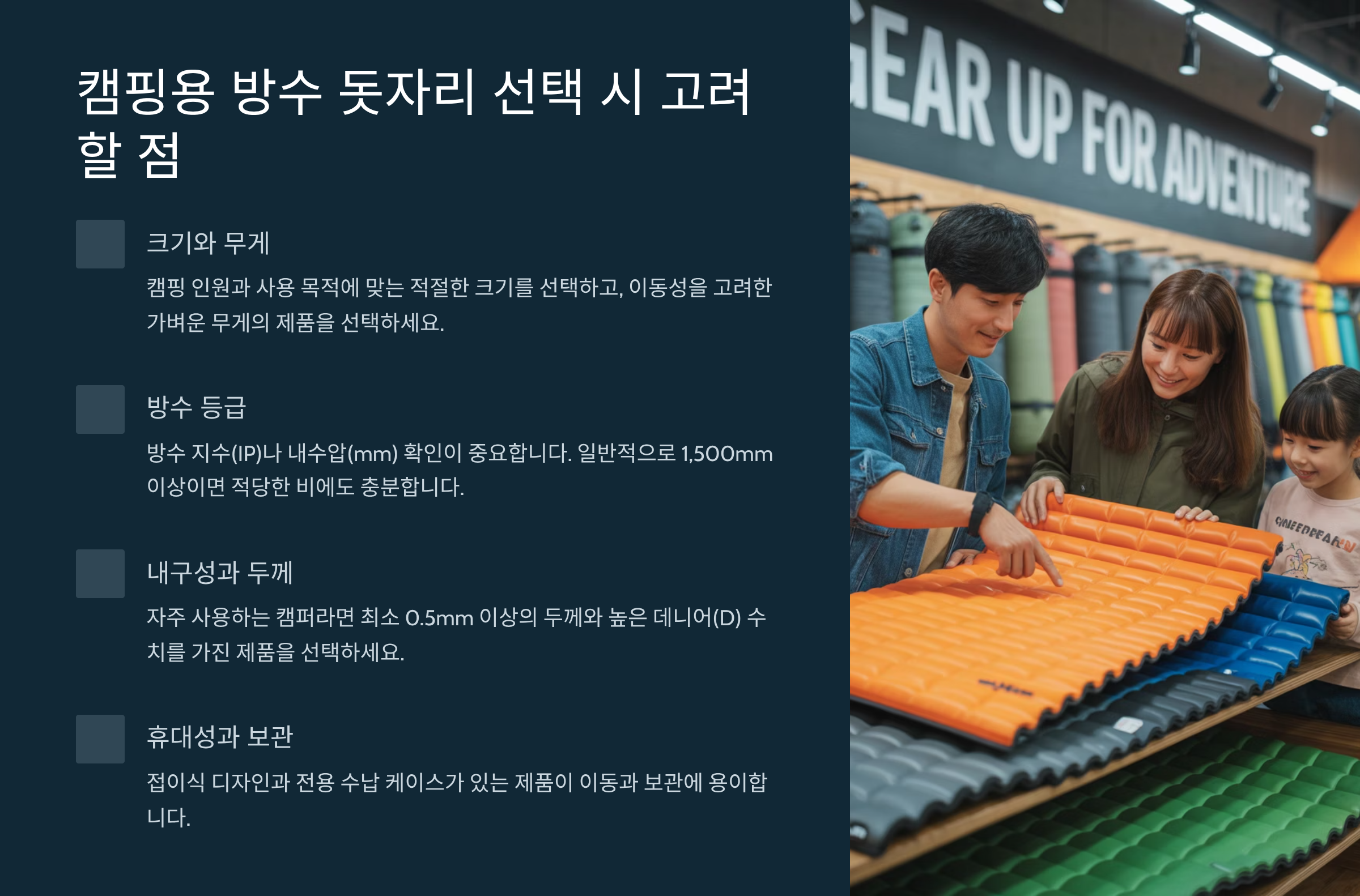 캠핑용 방수 돗자리 선택 시 고려할 점