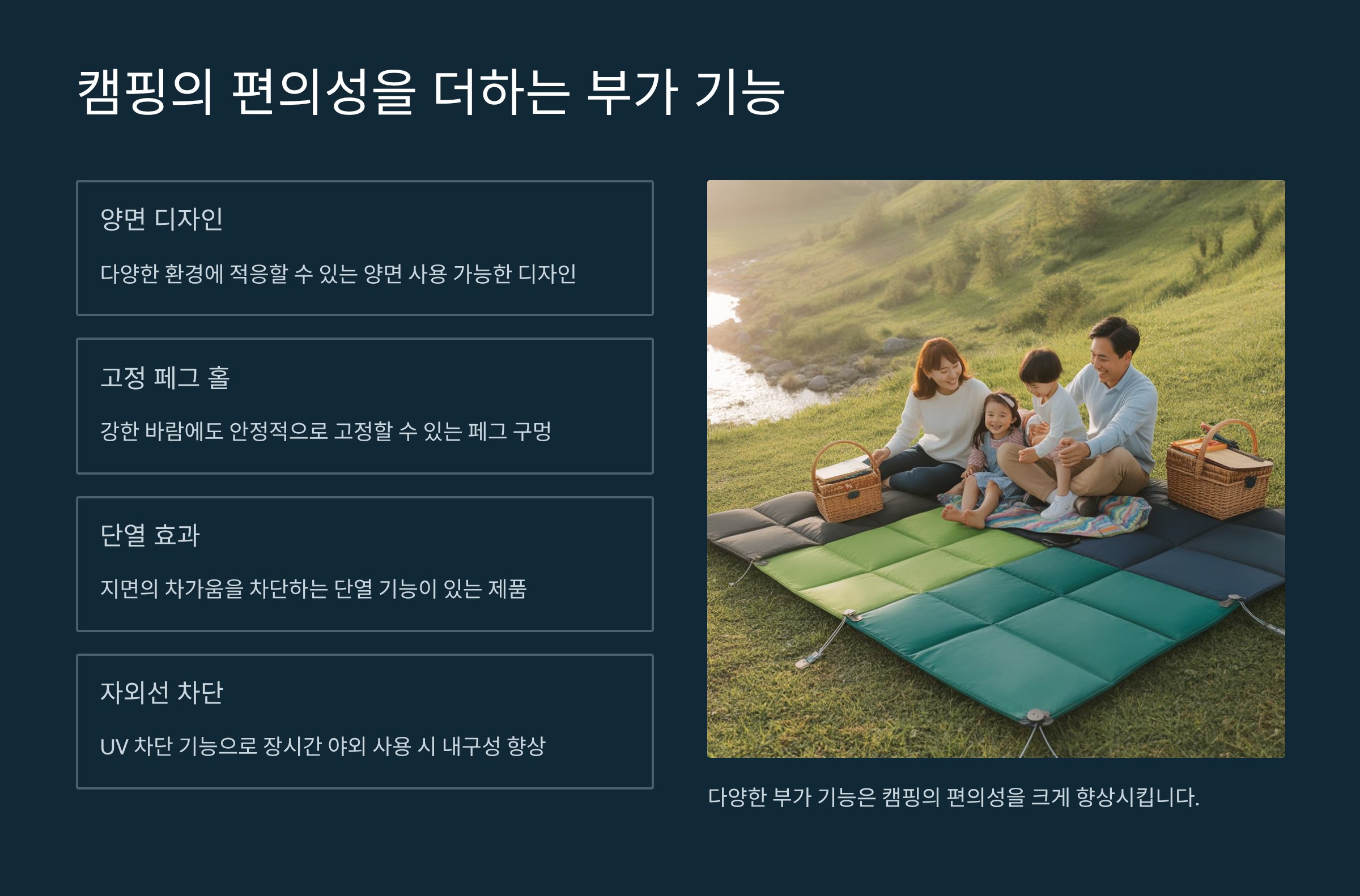좋은 캠핑용 방수 돗자리는 기본적인 방수 기능 외에도 다양한 부가 기능으로 사용자의 편의를 높입니다. 첫째, **고정용 고리(아일렛)**가 있는 제품은 바람이 부는 날 돗자리가 날아가지 않도록 팩을 박아 고정할 수 있어 매우 유용합니다. 특히 그라운드시트로 활용할 때 필수적인 기능입니다.
