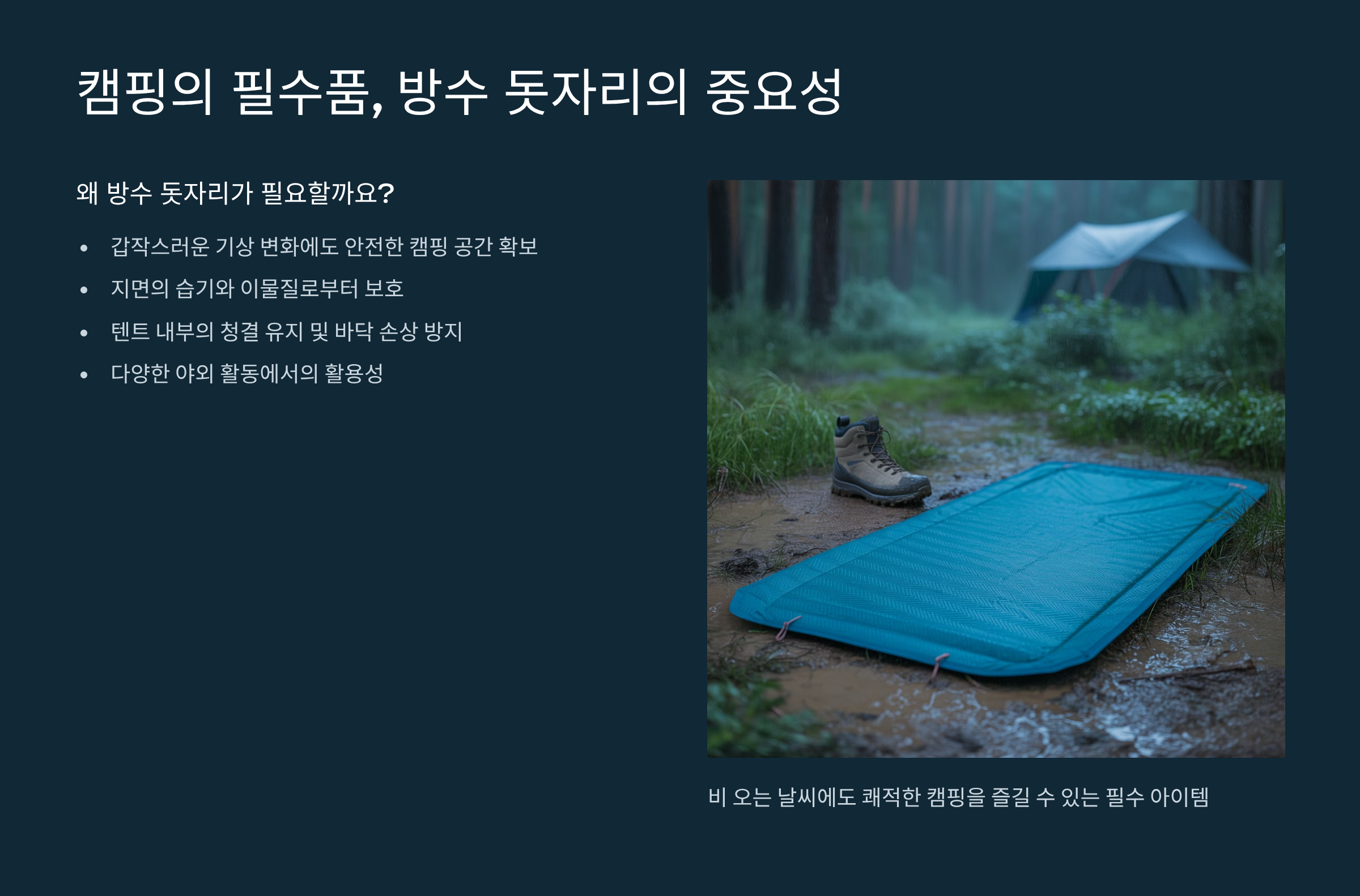캠핑은 자연 속에서 즐기는 특별한 경험이지만, 예측 불가능한 날씨는 언제나 변수로 작용합니다. 특히 갑작스럽게 내리는 비나 습한 땅은 텐트 안팎의 쾌적함을 해쳐 캠핑의 즐거움을 반감시키기 쉽습니다. 이럴 때 **방수 돗자리**는 캠핑의 질을 한층 더 높여주는 필수 아이템이 됩니다. 단순한 돗자리를 넘어, 젖은 땅으로부터 습기를 차단하고, 텐트 내부의 오염을 방지하는 중요한 역할을 수행하기 때문입니다.