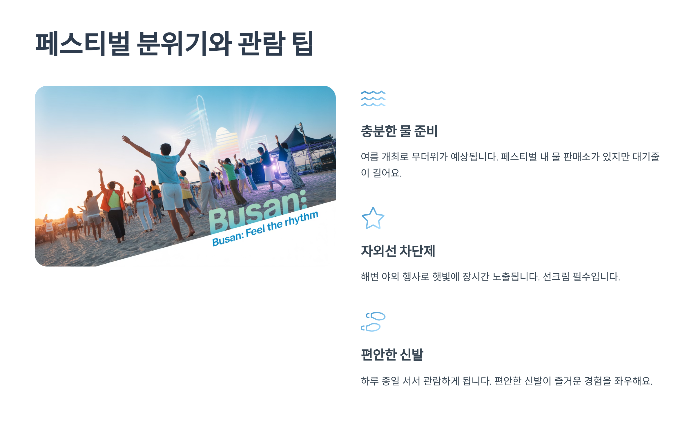 이제 페스티벌이 열리는 장소와 그 접근성, 그리고 부산이라는 도시가 제공하는 편의시설에 대해 알아볼게요. 멀리서 오는 방문객도 불편 없이 페스티벌을 즐길 수 있도록 정보가 가득해요!