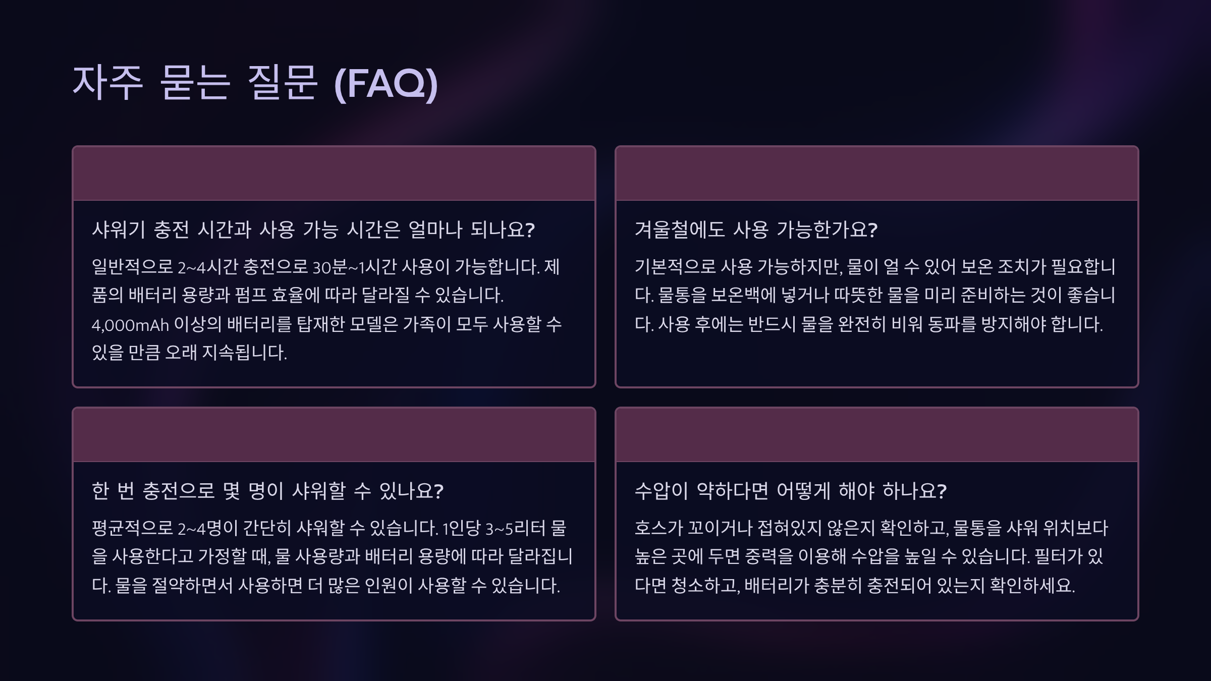 Q1. 충전식 캠핑 샤워기는 한 번 충전하면 얼마나 사용 가능한가요?