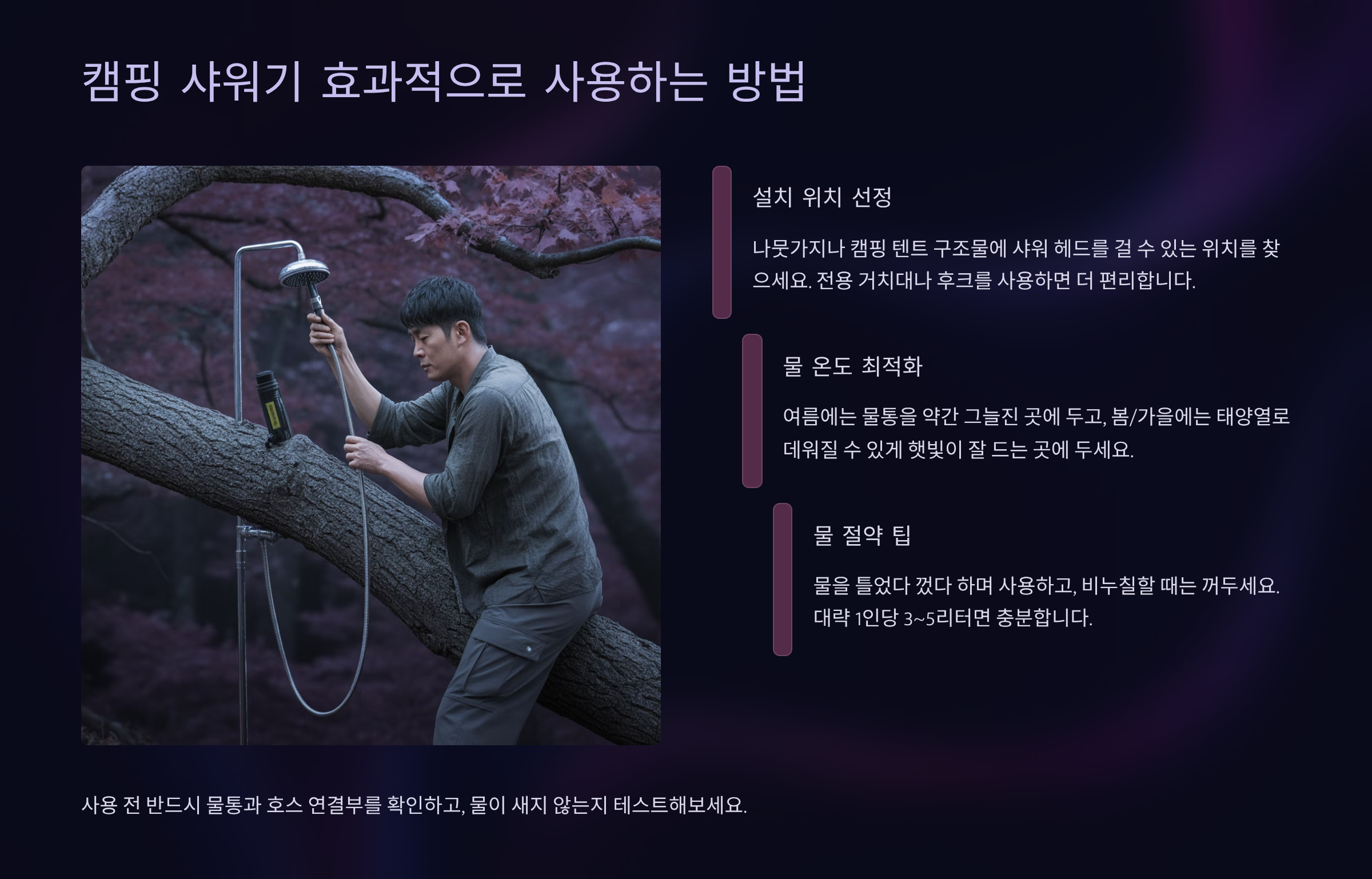 캠핑 샤워기를 효과적으로 사용하려면 몇 가지 팁을 알아두면 좋습니다. 물통에 따뜻한 물을 채워 사용하면 쌀쌀한 날씨에도 따뜻한 샤워를 즐길 수 있습니다. 샤워 펌프는 물통 바닥에 완전히 잠기도록 설치하고, 샤워 헤드는 고정용 거치대를 이용해 높은 곳에 걸어두면 두 손이 자유로워 편리합니다. 또한, 샤워 시에는 비누나 샴푸 사용을 자제하고 친환경 제품을 사용해야 합니다. 샤워 후 남은 물은 자연에 버리지 않고 지정된 장소에 버려야 환경을 보호할 수 있습니다.