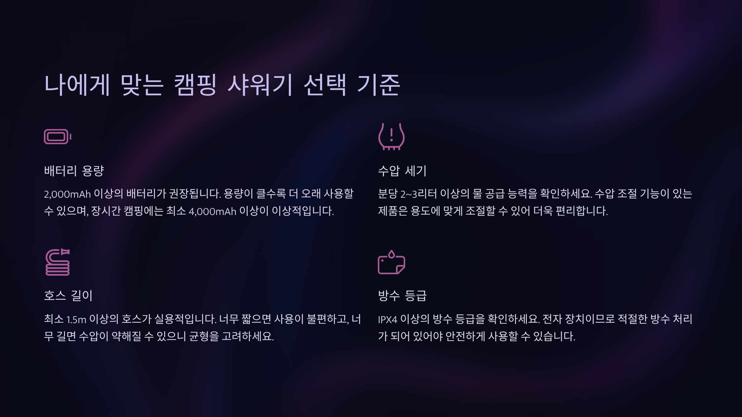 시중에 다양한 충전식 캠핑 샤워기가 출시되어 있어 어떤 제품을 선택해야 할지 고민이 될 수 있습니다. 가장 중요한 선택 기준은 배터리 용량입니다. 배터리 용량이 클수록 더 오래 사용할 수 있으므로, 캠핑 기간과 사용 목적을 고려하여 충분한 용량의 제품을 선택해야 합니다. 다음으로 수압을 확인해야 합니다. 너무 약한 수압은 샤워 시 불편함을 줄 수 있으므로, 최소 3L/min 이상의 분사량을 가진 제품을 추천합니다. 마지막으로, 안전성입니다. 방수 등급(IPX7 이상)과 KC 인증 여부를 확인하여 안전하게 사용할 수 있는 제품을 골라야 합니다.