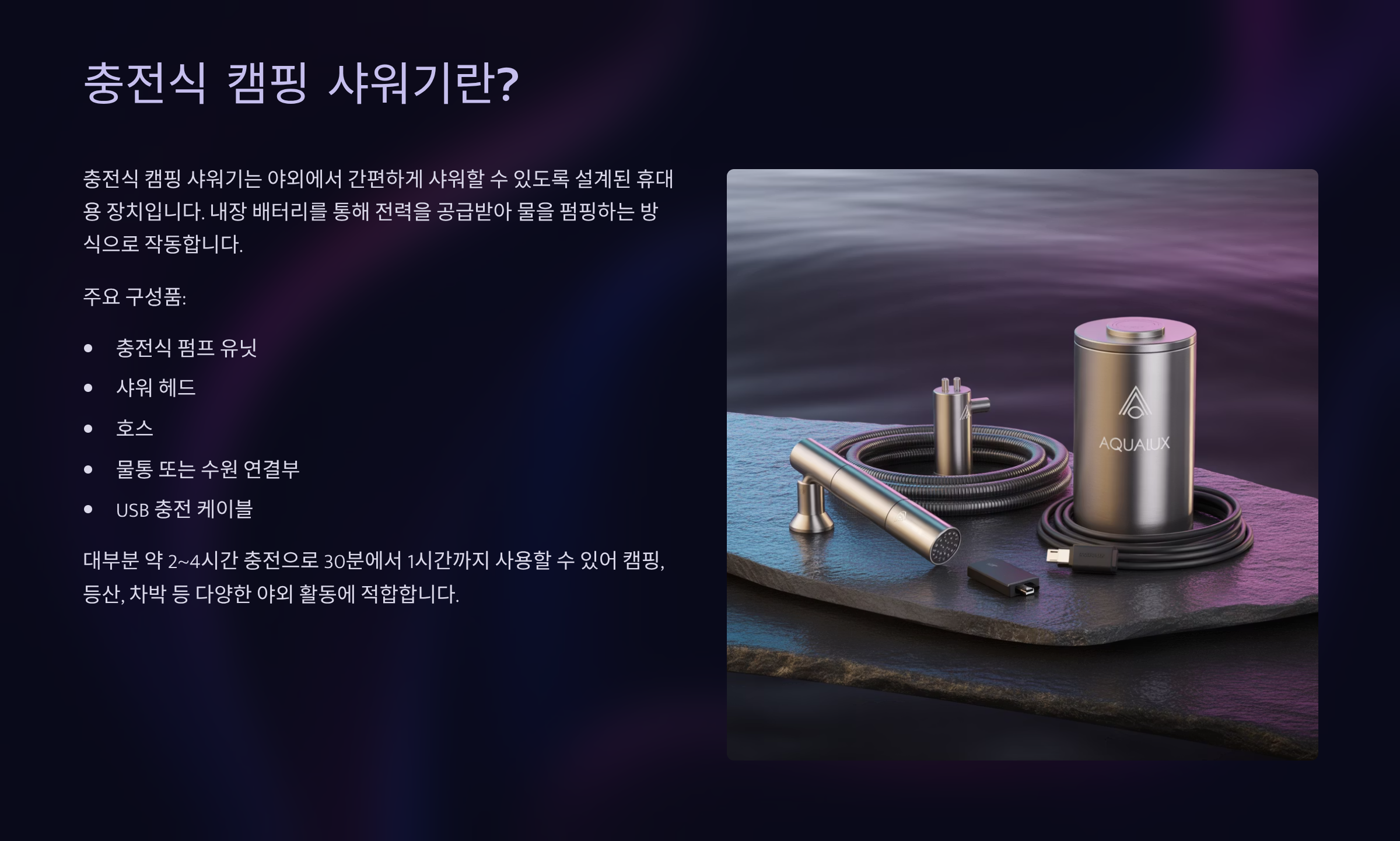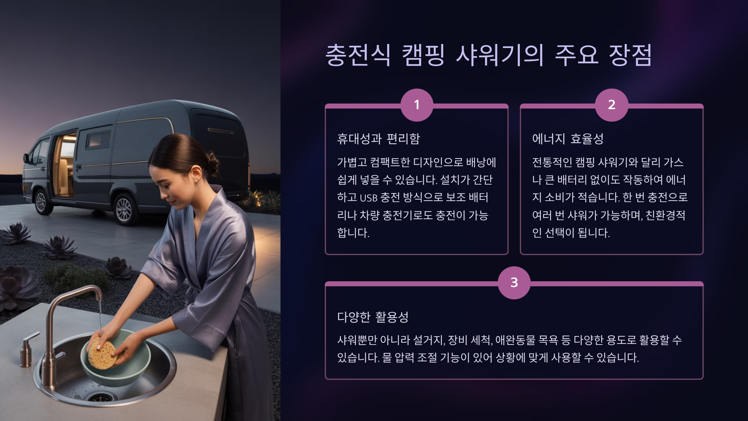 자연 속에서 여유를 즐기는 캠핑의 낭만은 누구나 꿈꾸지만, 샤워 시설이 없는 곳에서는 위생 문제가 큰 고민거리입니다. 특히 여름철 땀과 끈적임은 캠핑의 즐거움을 반감시키기 마련이죠. 이런 불편함을 해결해 줄 혁신적인 아이템이 바로 '충전식 캠핑 샤워기'입니다.