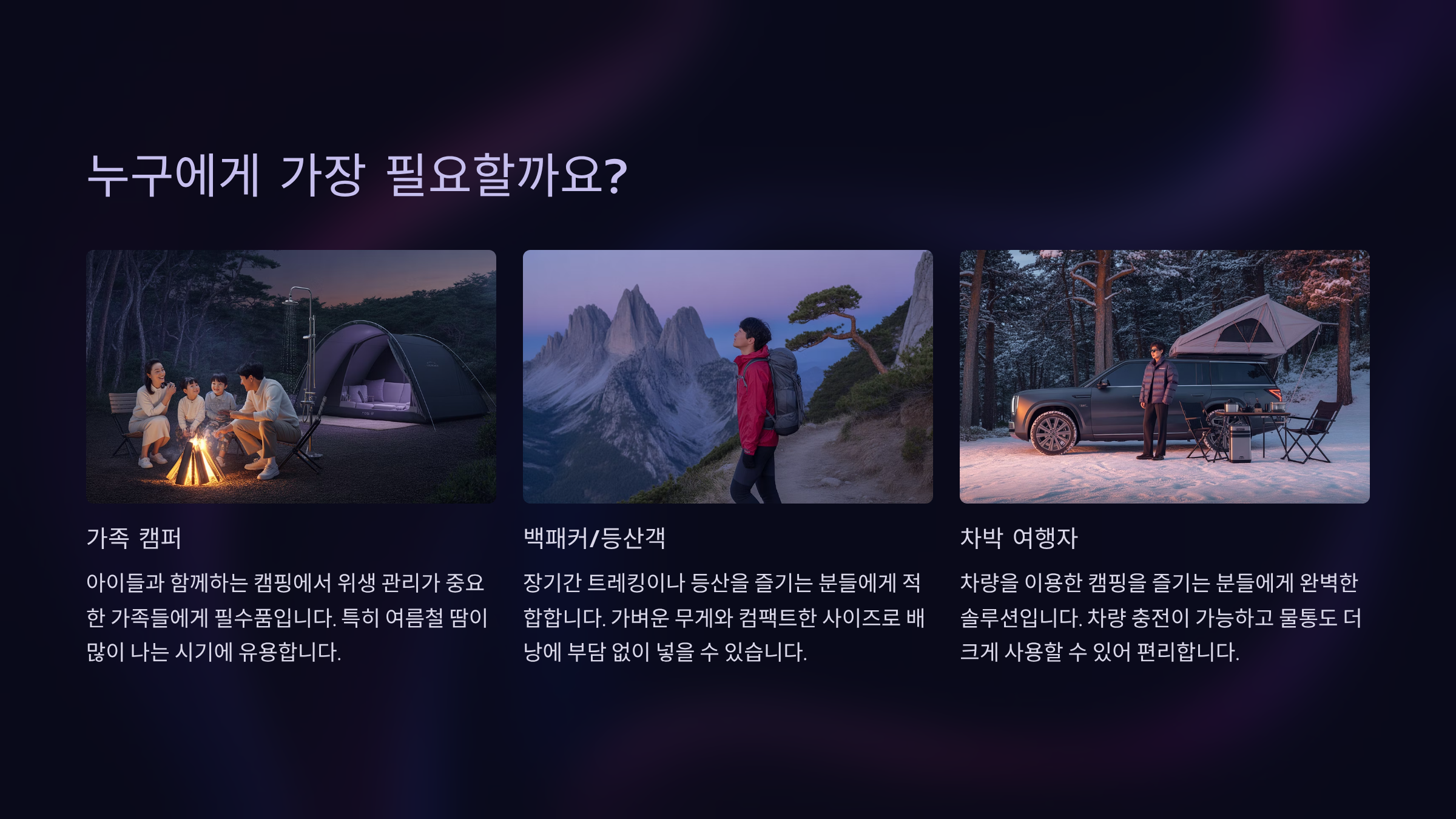 | 배터리 용량 | 캠핑 기간에 맞는 충분한 용량인지 확인 (mAh) |
