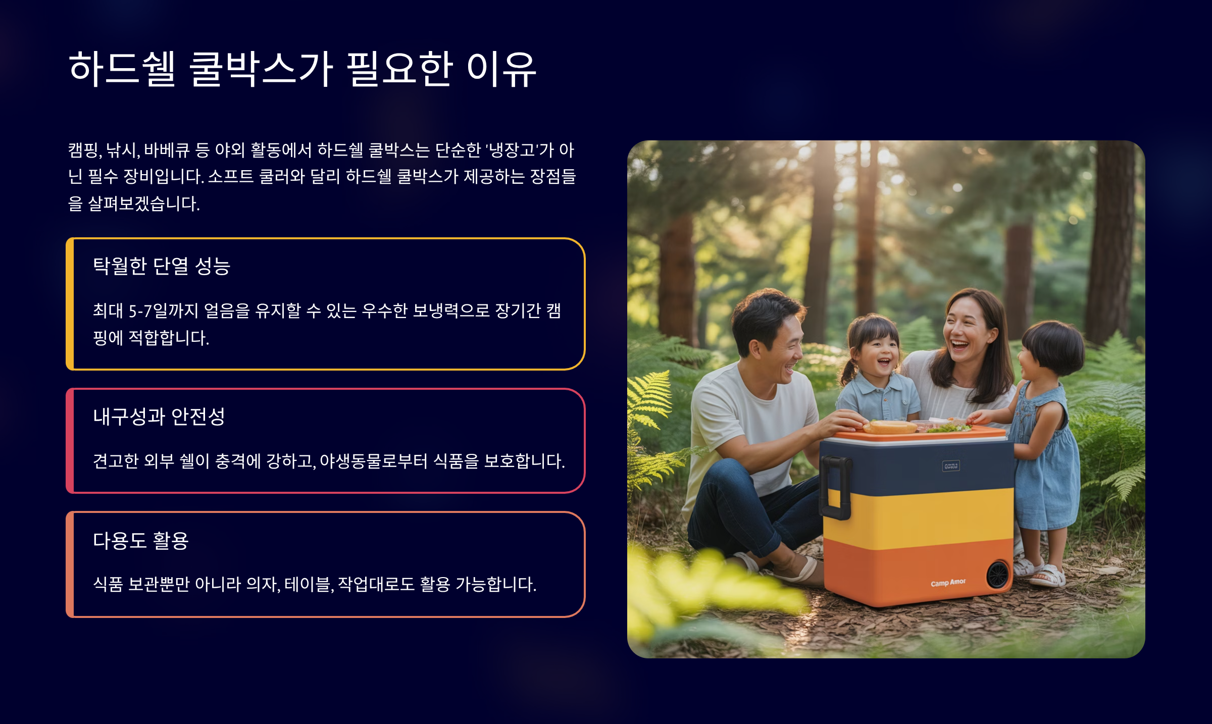 단순히 제품을 나열하는 것을 넘어, **하드쉘 쿨박스의 원리, 용량 선택 팁, 주요 브랜드별 특징, 그리고 올바른 사용 및 관리법**까지 심도 있게 다룹니다. 이 글을 통해 여러분의 캠핑 스타일에 딱 맞는 쿨박스를 찾고, 더욱 즐겁고 쾌적한 캠핑을 경험하시길 바랍니다.