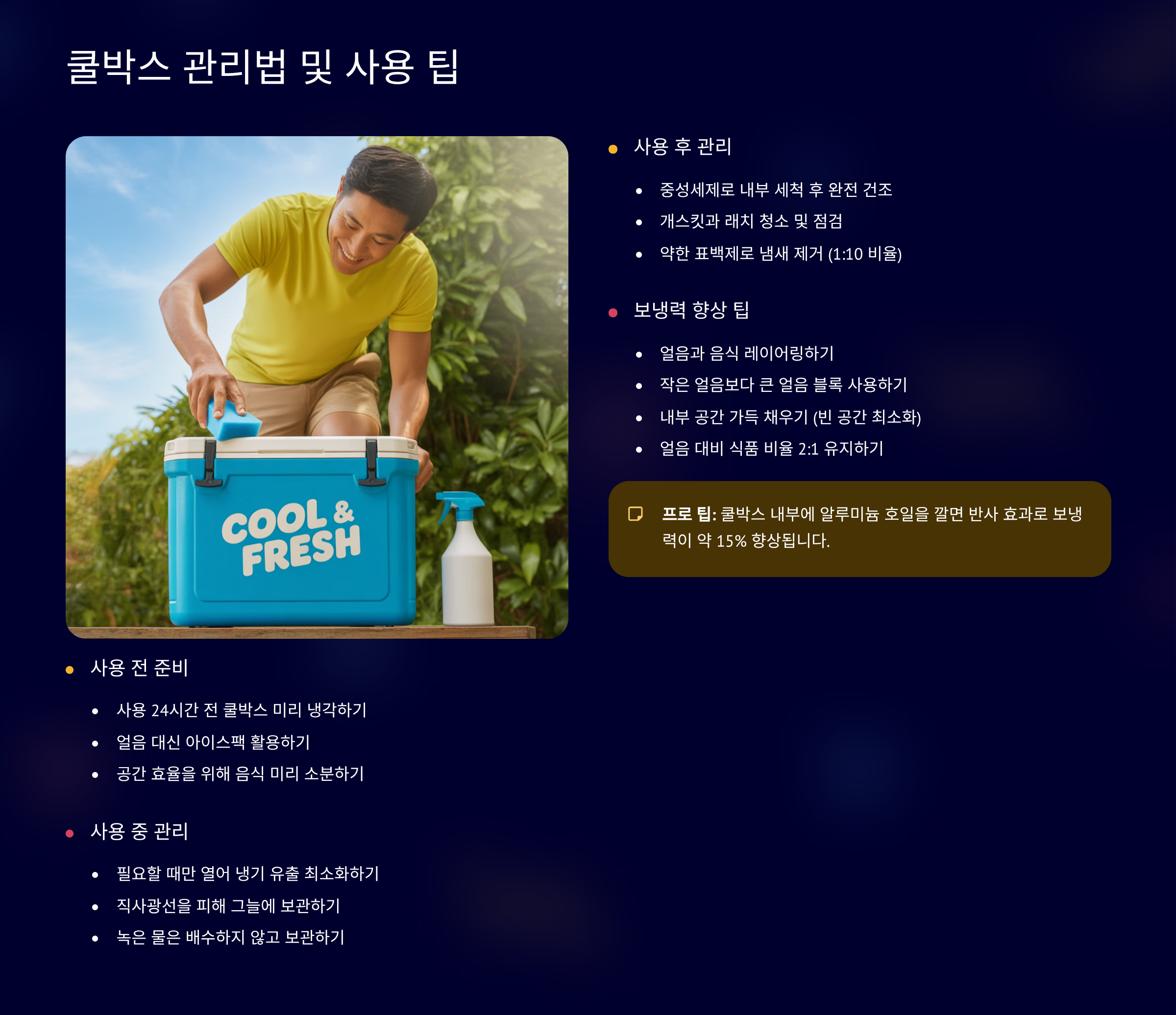 이 글은 정보 제공을 목적으로 작성되었으며, 특정 제품의 효능을 보증하거나 전문가의 자문을 제공하지 않습니다. 쿨박스의 보냉 성능과 내구성은 사용 환경, 관리 방법, 제품 모델에 따라 달라질 수 있습니다. 구매 전에는 반드시 제품 상세 정보와 사용 후기를 꼼꼼히 확인하고, 자신의 캠핑 스타일에 맞는 제품을 선택하시기 바랍니다. 이 글의 정보 오류로 인해 발생하는 어떠한 손해에 대해서도 작성자는 책임을 지지 않습니다.