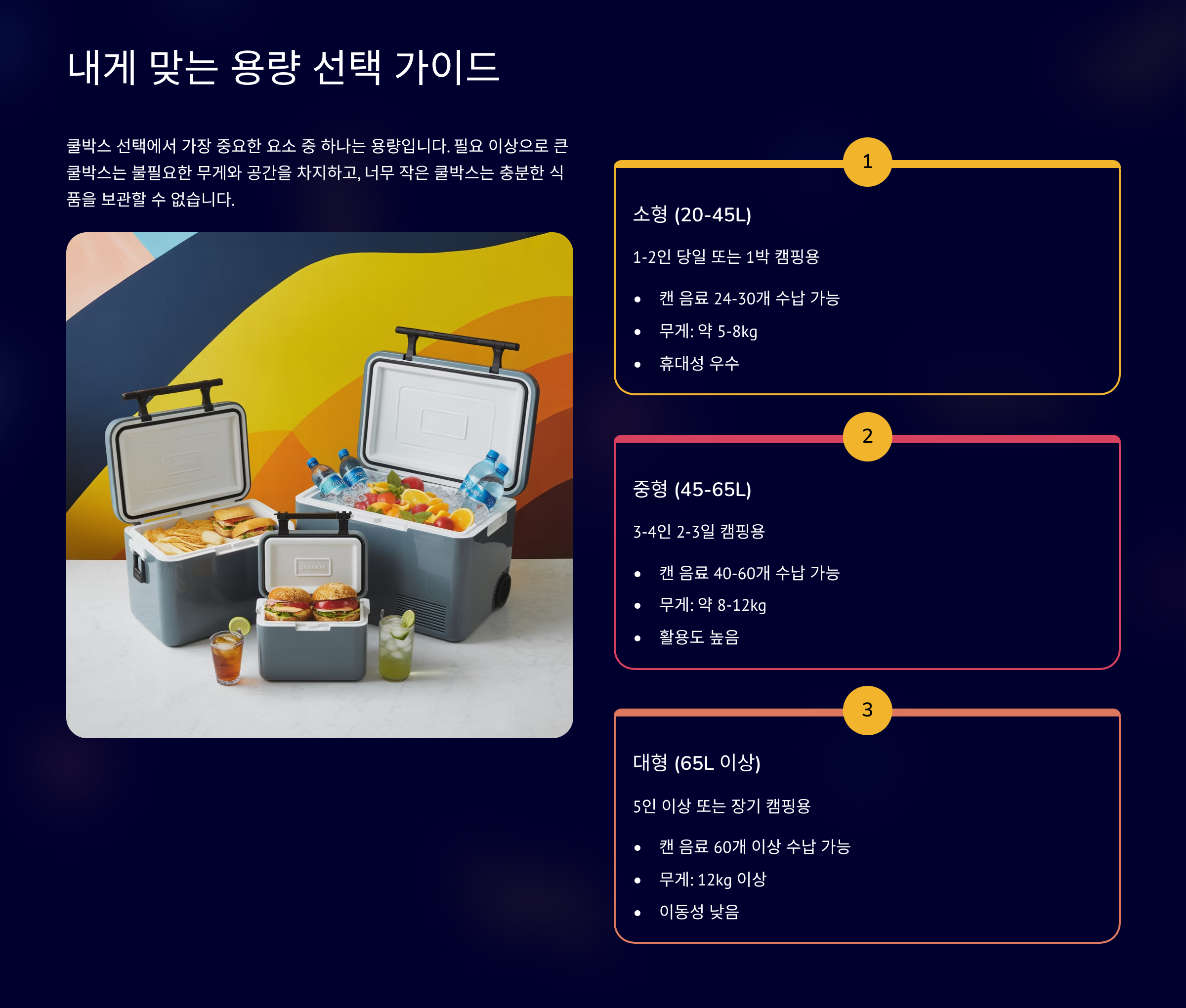| 솔로/커플 (1박 2일) | 20~30QT | 휴대 용이, 가벼운 캠핑 |