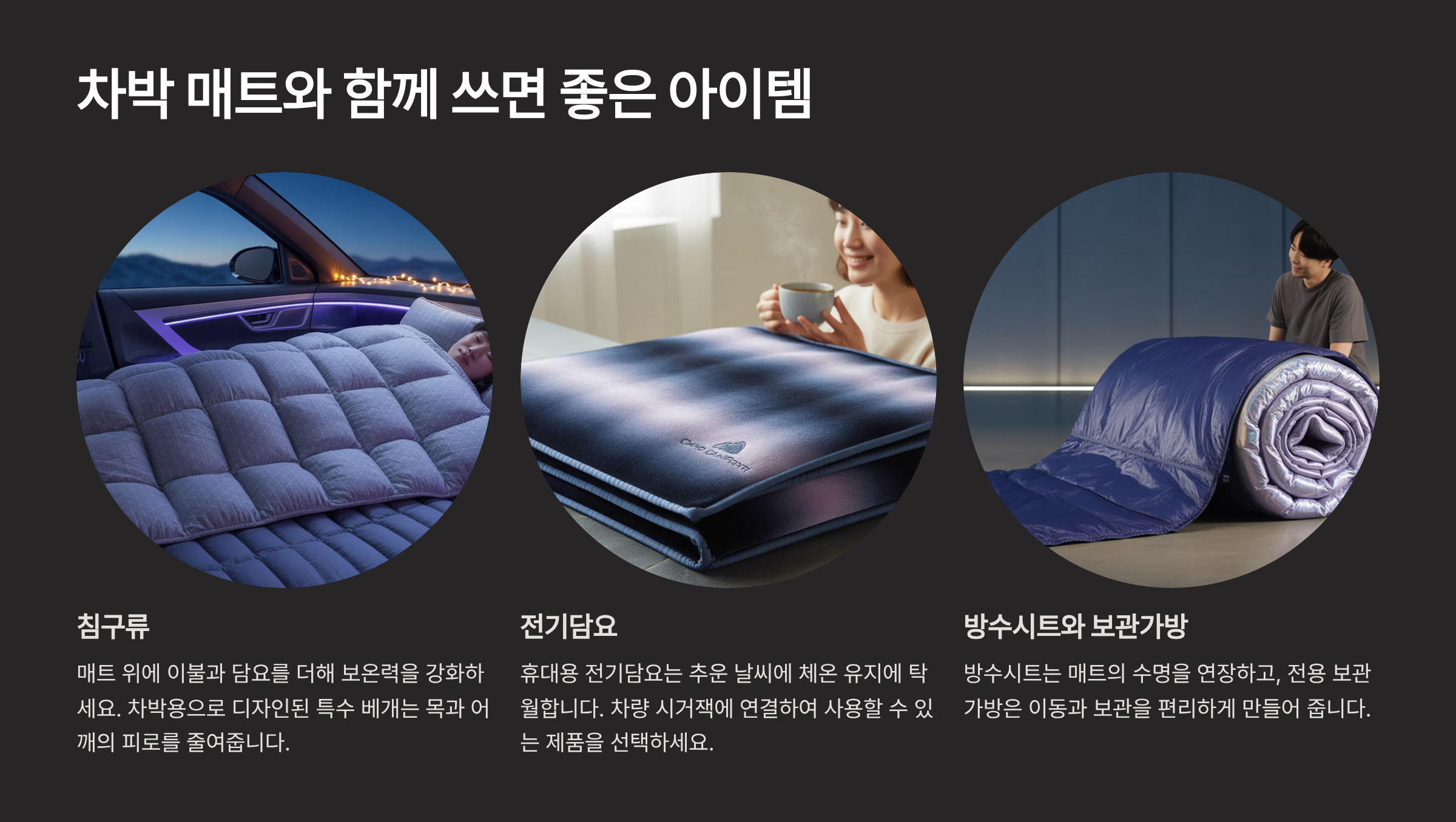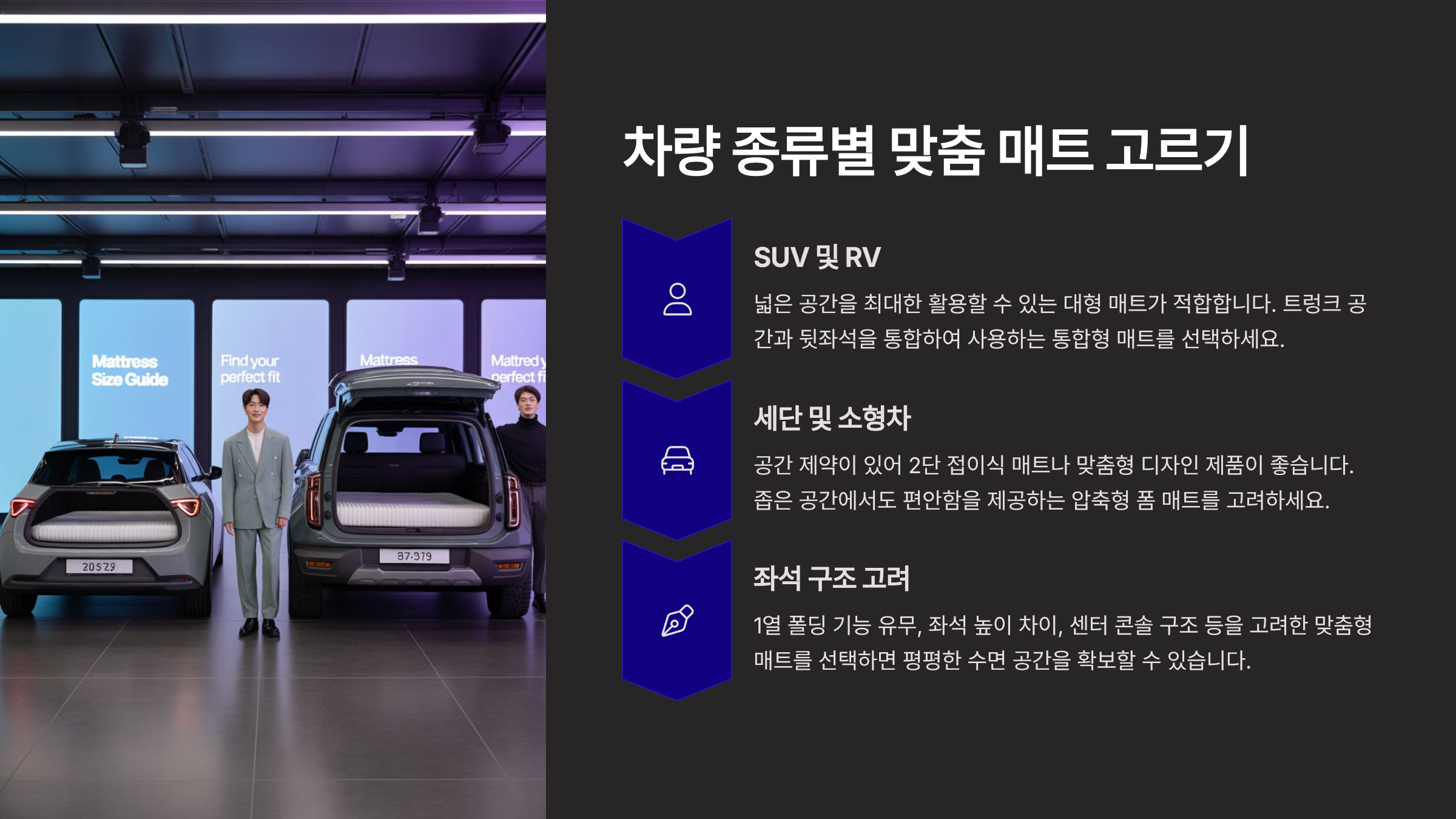 A. 매트의 두께, 쿠션감, 수납 부피, 그리고 차량 내부 사이즈와의 적합성을 가장 중요하게 고려해야 합니다.