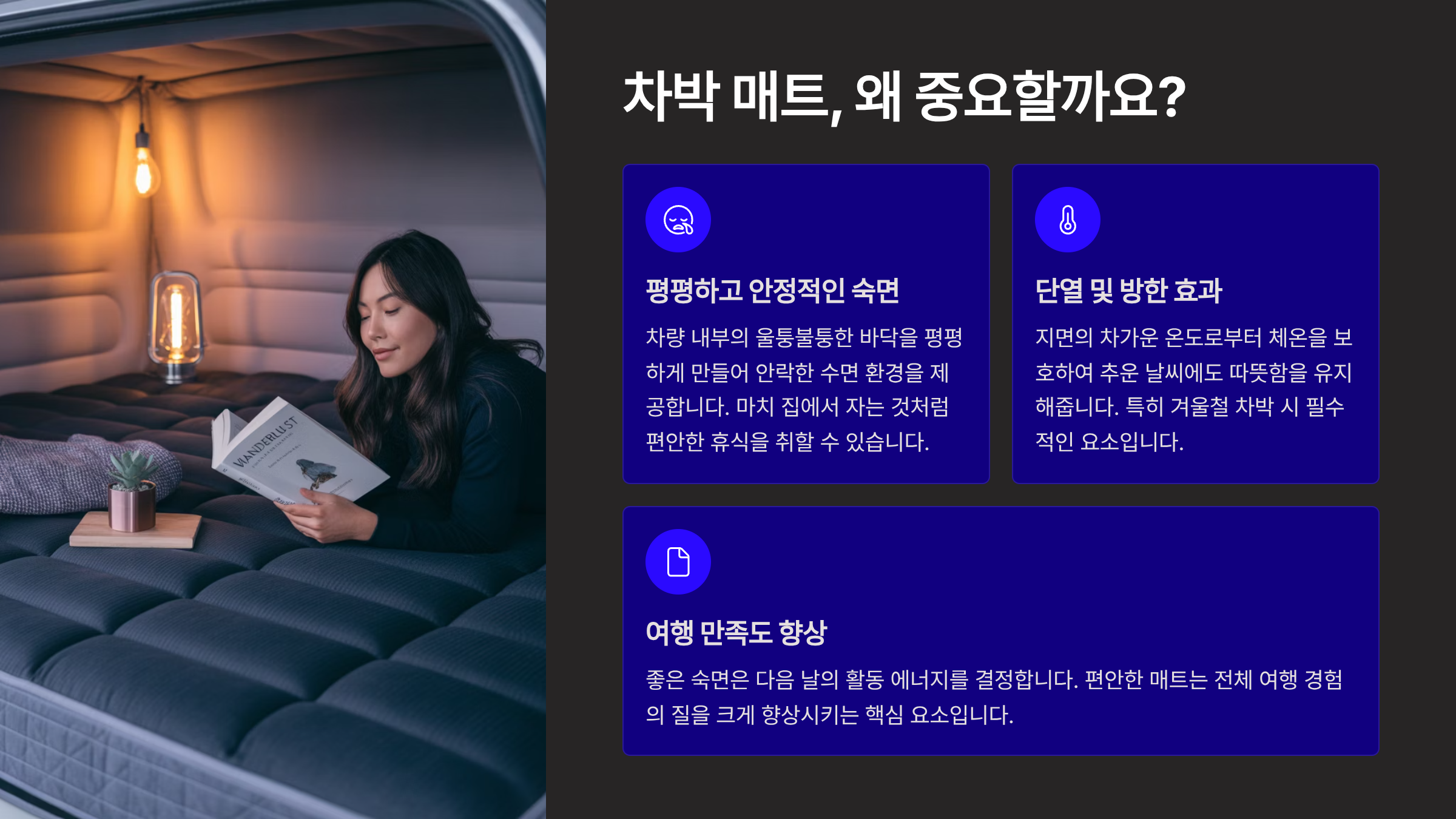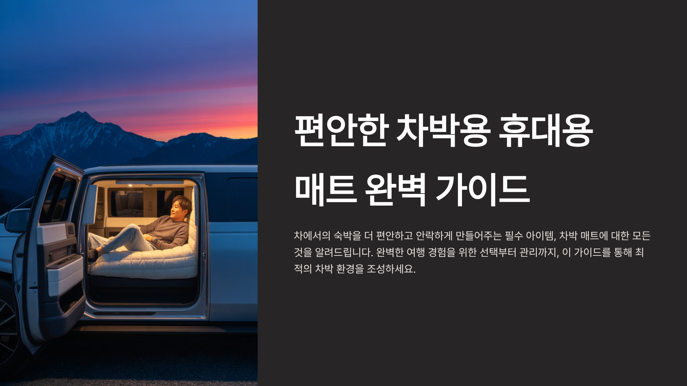 캠핑의 새로운 트렌드로 자리 잡은 차박! 자동차만 있다면 어디든 떠날 수 있는 자유로움이 매력이지만, 불편한 잠자리 때문에 망설이는 분들이 많습니다. 차박의 만족도를 결정짓는 가장 중요한 요소는 바로 편안한 잠자리입니다. 바닥의 딱딱함과 울퉁불퉁함 때문에 밤새 뒤척이게 된다면 모처럼 떠난 여행의 즐거움도 반감될 수밖에 없습니다.