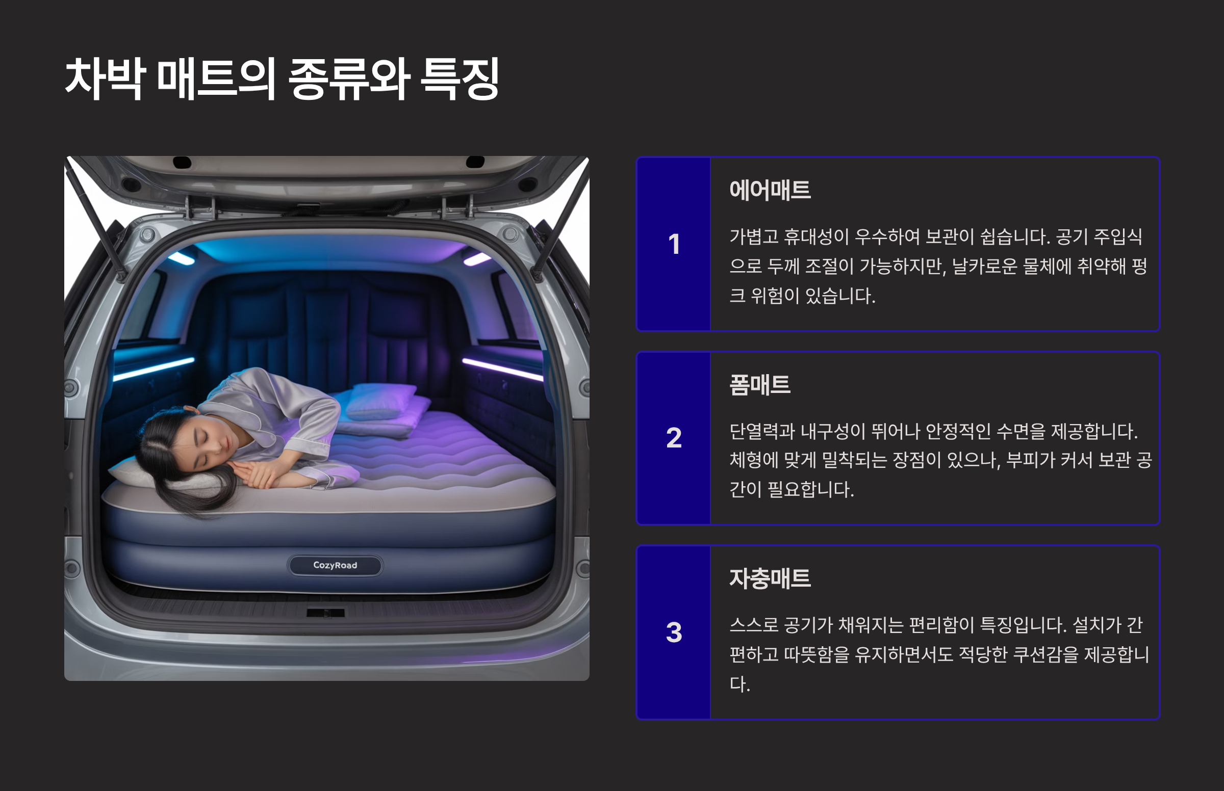 | SUV / 미니밴 | 두꺼운 자충식 또는 에어 매트 | 차량 내부 사이즈에 맞는 맞춤형 매트 고려 |