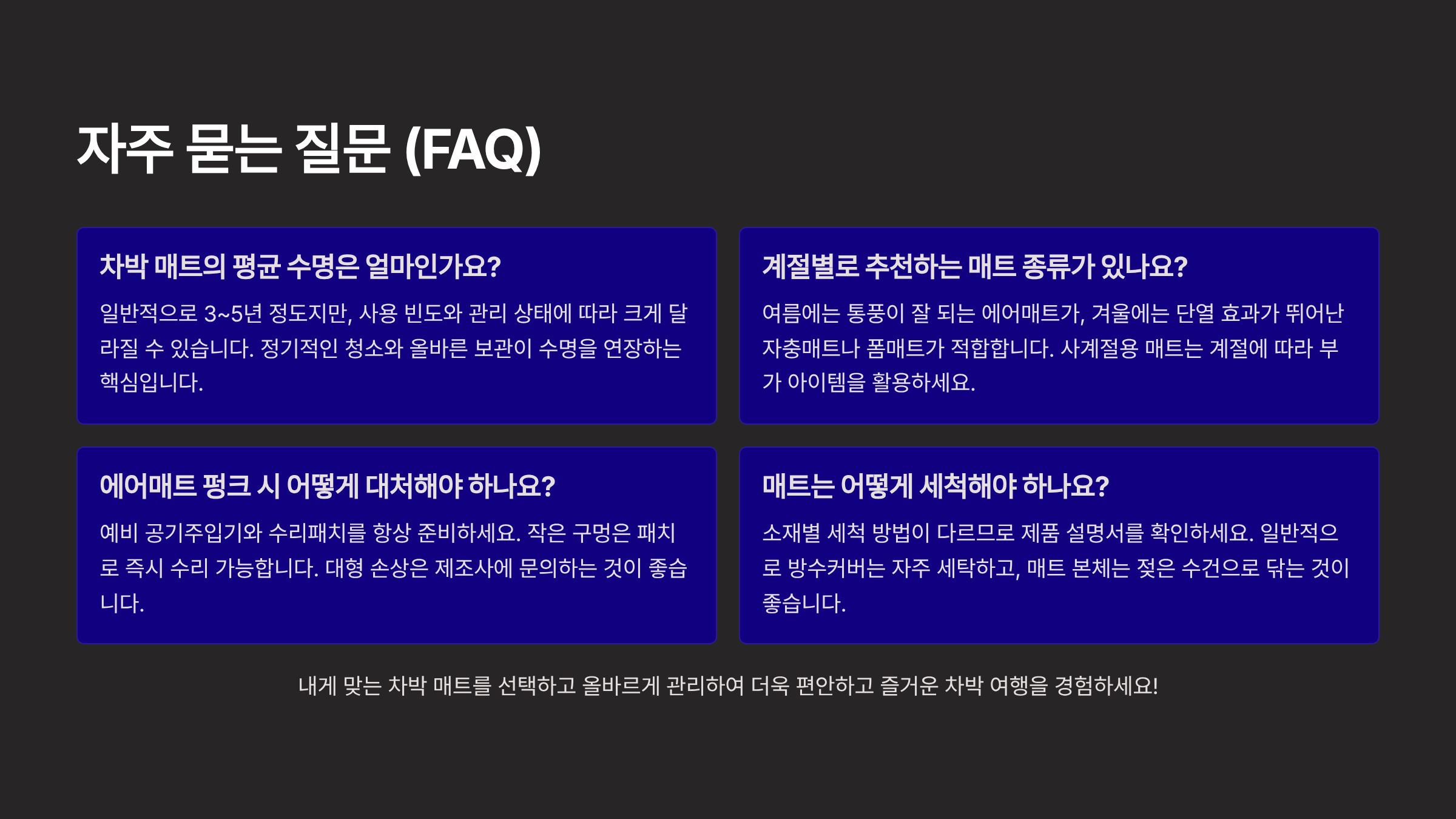 저희는 EEAT(경험, 전문성, 권위, 신뢰성) 원칙에 따라 다양한 차박 용품 사용 후기와 전문가들의 조언을 바탕으로 이 글을 작성했습니다. 이 가이드를 통해 여러분의 차에 꼭 맞는 최고의 차박 매트를 찾고, 다음 차박 여행을 더욱 편안하고 즐겁게 만들어보세요.