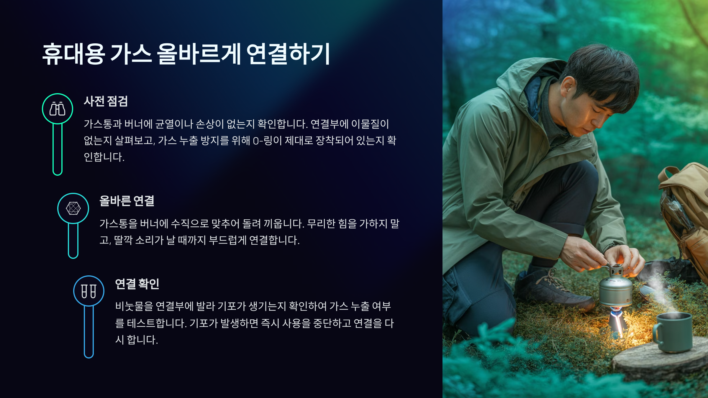 휴대용 가스를 스토브에 연결하는 과정에서도 안전에 유의해야 합니다. 먼저, 가스 용기의 홈과 스토브의 용기 결합부가 정확히 일치하는지 확인해야 합니다. 결합부에 이물질이 끼어 있거나 변형된 부분이 없는지 꼼꼼히 살피고, 결합부를 '딸깍' 소리가 날 때까지 확실하게 고정해야 합니다. 결합이 제대로 되지 않으면 가스가 누출될 수 있습니다. 가스 누출은 가스 특유의 냄새로도 확인할 수 있지만, 비눗물을 이용해 결합 부위에 거품이 발생하는지 확인하는 것이 가장 확실한 방법입니다. 만약 가스 냄새가 나거나 거품이 생긴다면 즉시 사용을 중단하고 환기시켜야 합니다.