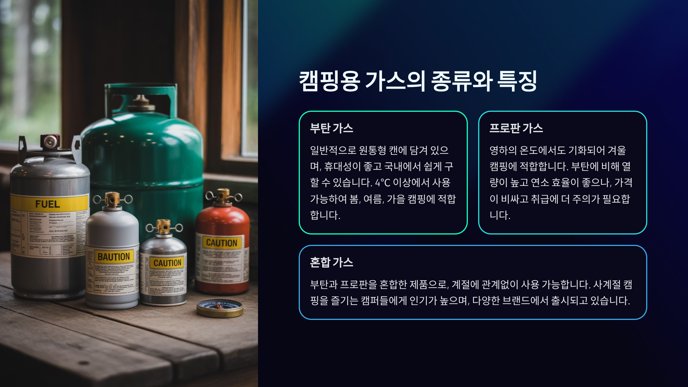 | 이소부탄 가스 | 저온에서 화력 안정적, 가격이 상대적으로 비쌈 | 겨울, 고지대 캠핑 |