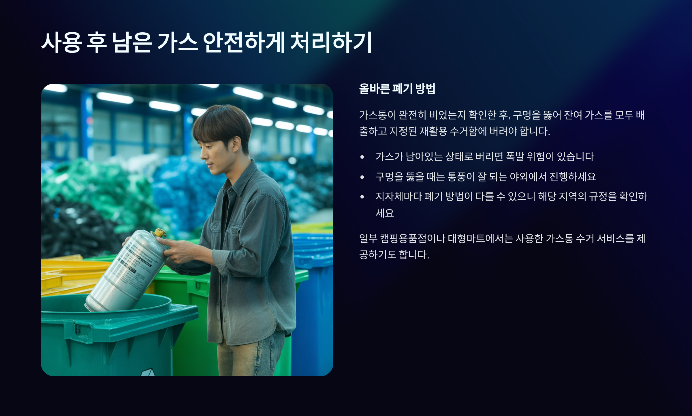 캠핑을 마치고 사용 후 남은 휴대용 가스를 처리하는 과정 또한 중요합니다. 절대 가스 용기를 그대로 버려서는 안 됩니다. 가스 용기 내부에 남아 있는 소량의 가스가 폭발의 원인이 될 수 있기 때문입니다. 가스 용기는 남은 가스를 완전히 제거한 후 버려야 합니다. 시중에는 가스 용기에 구멍을 뚫어 남은 가스를 배출하는 전용 도구가 판매되고 있습니다. 이 도구를 사용하여 가스를 완전히 제거하고, 구멍을 뚫은 뒤 분리수거해야 합니다. 이 과정은 반드시 화기가 없는 야외에서 진행해야 합니다. 올바른 폐기 방법은 환경 보호에도 기여하며, 무엇보다도 주변 사람들의 안전을 지키는 중요한 행동입니다.