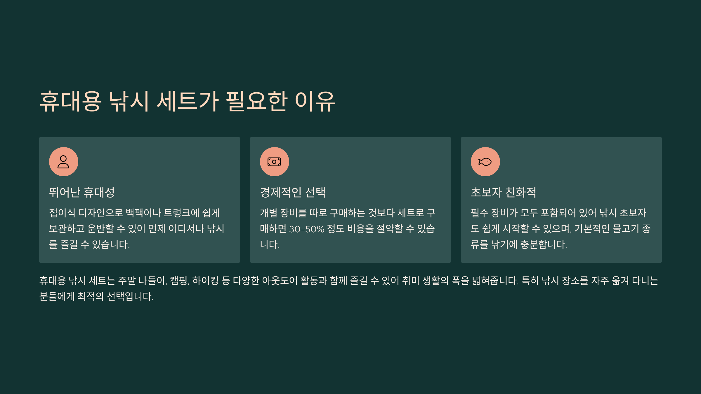 | 편리성 | 모든 장비가 세트로 구성됨 | 낚시를 처음 시작하는 초보자 |