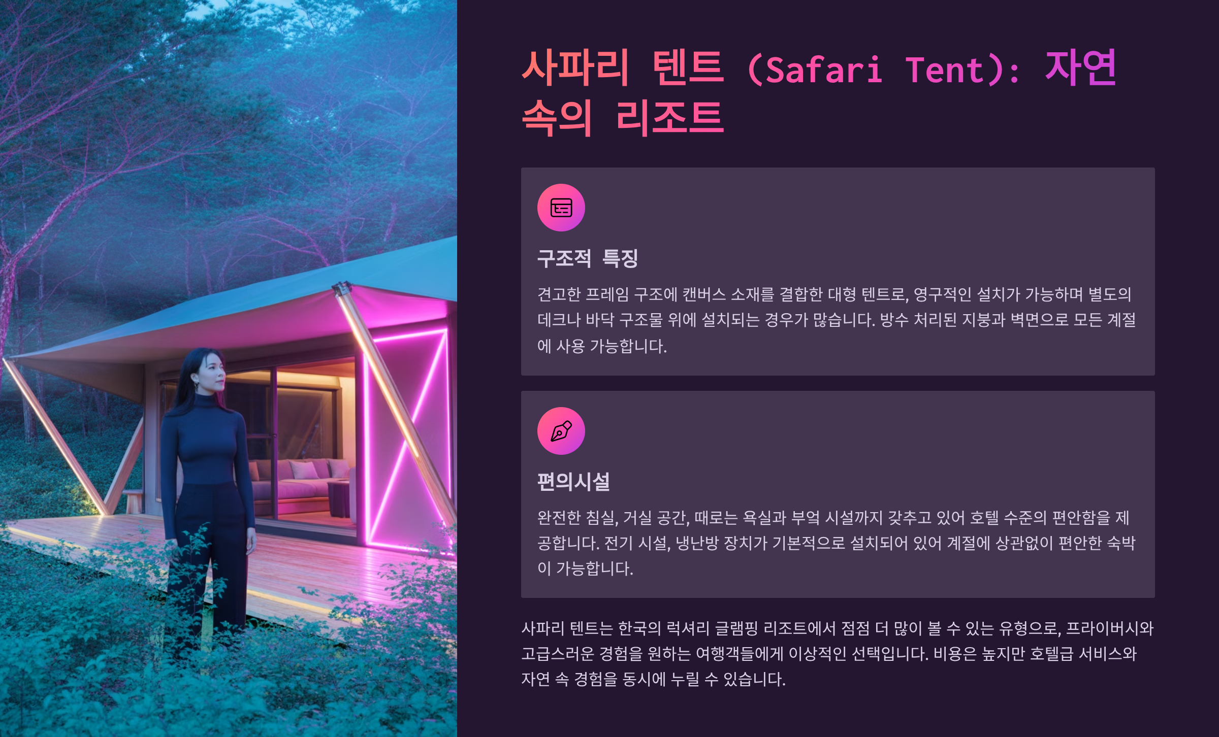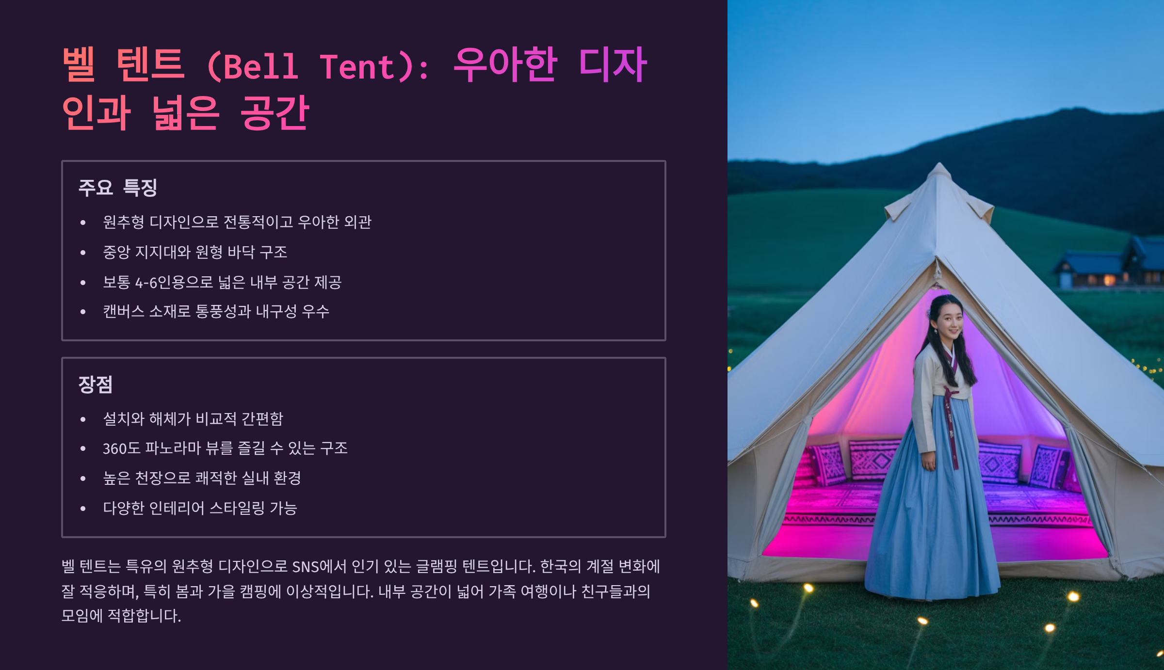 럭셔리 글램핑 텐트는 단순히 잠만 자는 공간이 아니라, 자연 속에서 편안하게 휴식을 취할 수 있는 또 하나의 '집'입니다. 텐트마다 고유한 디자인과 특징이 있어, 어떤 텐트를 선택하느냐에 따라 글램핑의 분위기와 경험이 크게 달라집니다. 이 글에서는 가장 인기 있는 럭셔리 글램핑 텐트 종류를 **EEAT(경험, 전문성, 권위성, 신뢰성)** 기반으로 상세히 분석하여, 여러분의 취향과 목적에 맞는 최고의 텐트를 찾는 데 도움을 드리고자 합니다.