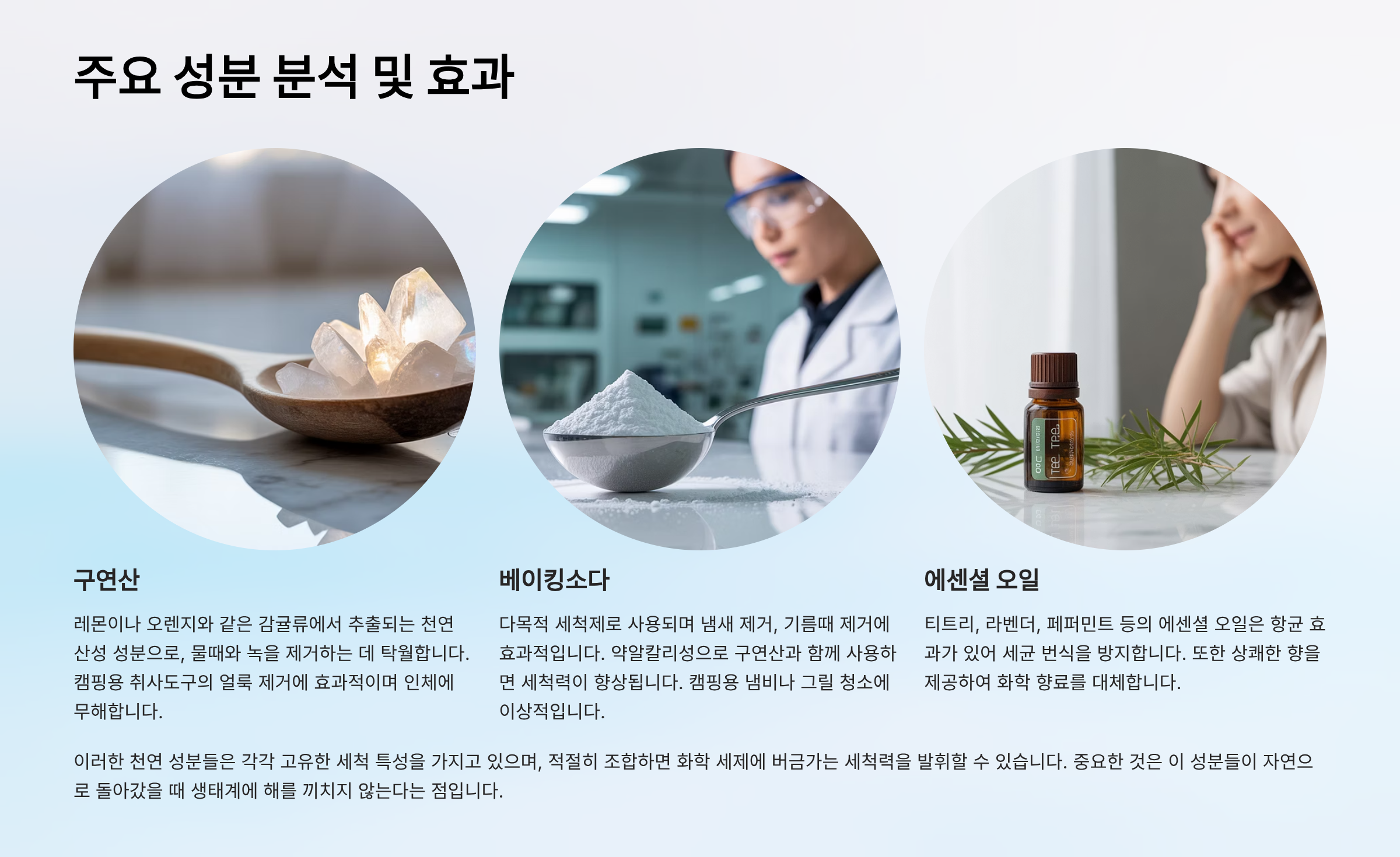 친환경 세척제의 핵심은 바로 성분입니다. 대표적인 친환경 성분으로는 EM(유용미생물) 발효액, 베이킹소다, 구연산, 그리고 코코넛 유래 계면활성제 등이 있습니다. EM은 미생물의 발효 작용을 통해 오염 물질을 분해하고 악취를 제거하는 효과가 있어, 자연 정화 능력에 큰 도움을 줍니다. 베이킹소다는 약알칼리성 성분으로 기름때나 찌든 때를 효과적으로 제거하며, 구연산은 산성 성분으로 물때나 얼룩을 없애는 데 탁월합니다. 코코넛 유래 계면활성제는 일반 세제에 사용되는 석유계 계면활성제와 달리 생분해성이 뛰어나고 피부에 자극이 적다는 장점이 있습니다. 이 외에도 솝베리나 무환자나무 열매 추출물처럼 천연 성분을 활용한 제품들도 많이 출시되고 있습니다. 이처럼 다양한 성분을 활용하는 친환경 세척제는 단순한 세척 기능을 넘어, 자연의 힘을 빌려 깨끗함을 유지하고 환경을 보호하는 역할을 동시에 수행합니다. 각 성분의 특징을 이해하면, 자신의 필요에 맞는 제품을 더 현명하게 선택할 수 있습니다. 예를 들어, 기름기가 많은 캠핑 요리 후에는 베이킹소다 성분이 포함된 제품이 효과적이고, 물때나 냄새 제거가 필요하다면 EM 발효액이 들어간 제품이 좋습니다.