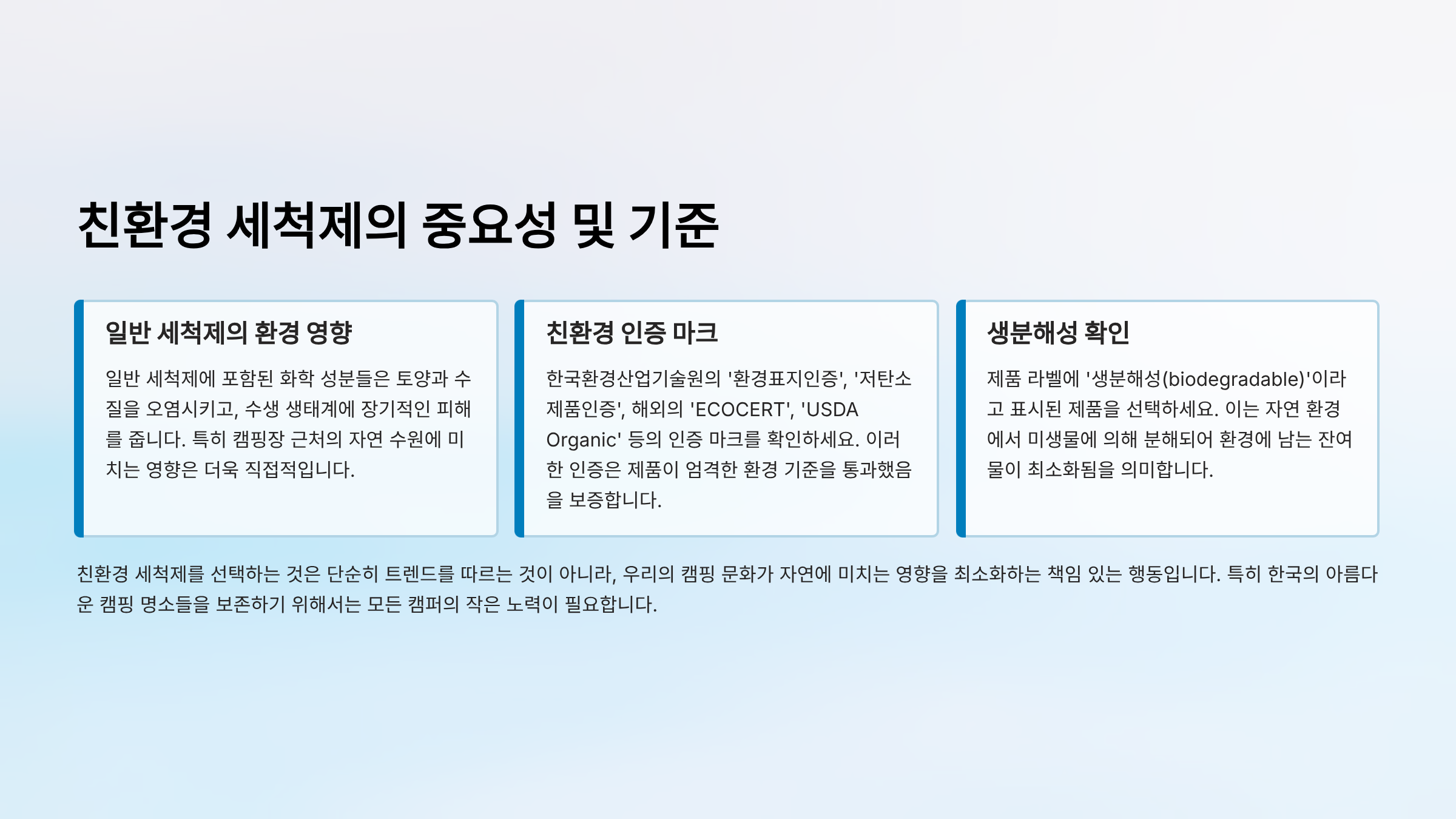 본 가이드를 통해 캠퍼들은 자신의 캠핑 스타일에 맞는 최적의 친환경 세척제를 찾고, 환경 보호라는 중요한 가치를 실현하는 데 한 걸음 더 나아갈 수 있을 것입니다. 단순한 제품 추천을 넘어, 자연과 공존하는 캠핑 문화를 만들어가는 데 필요한 실질적인 정보들을 제공하고자 노력했습니다.