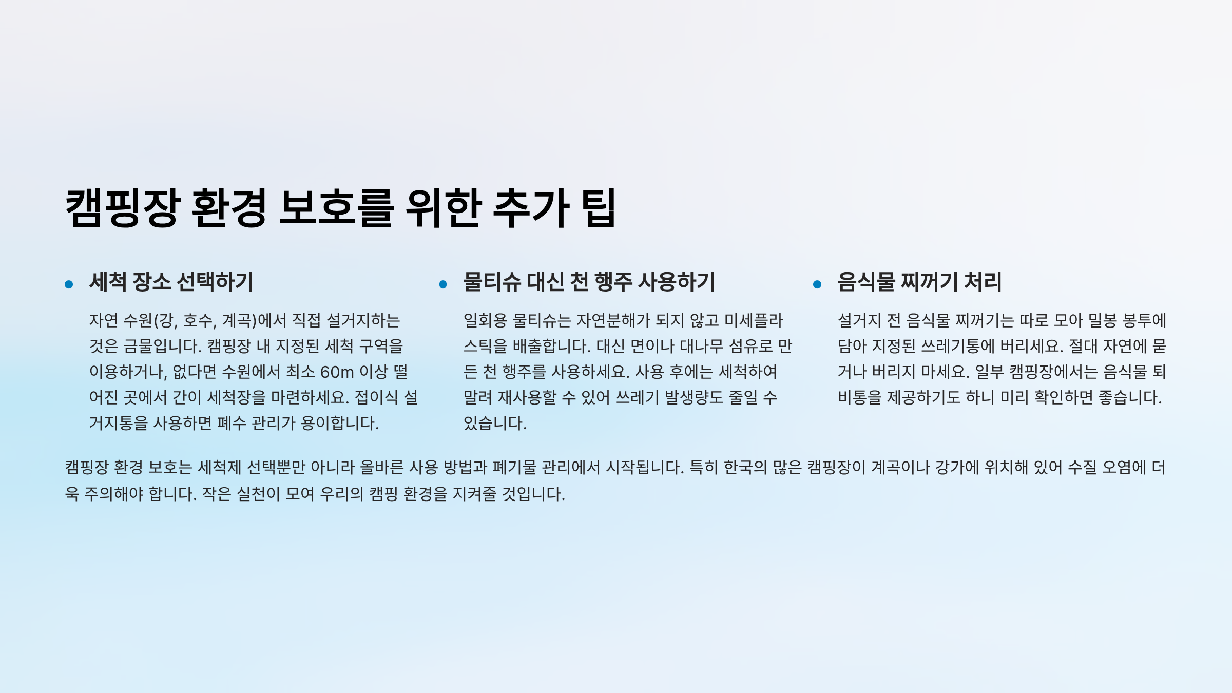 | 시설 이용 | 지정된 세척 시설, 분리수거 이용 | 자연 환경 보호, 폐기물 관리 |