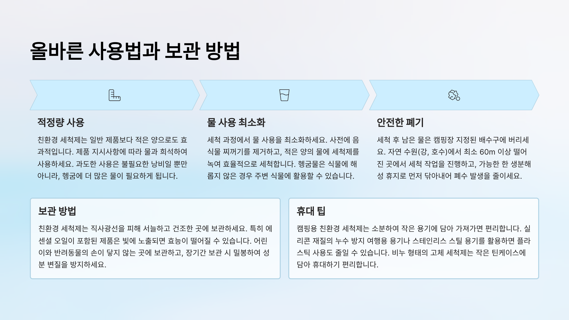 | 액상 세제 | 편리한 사용, 우수한 세척력 | 플라스틱 용기 발생 | 대규모 캠핑, 편리성을 중시하는 캠퍼 |