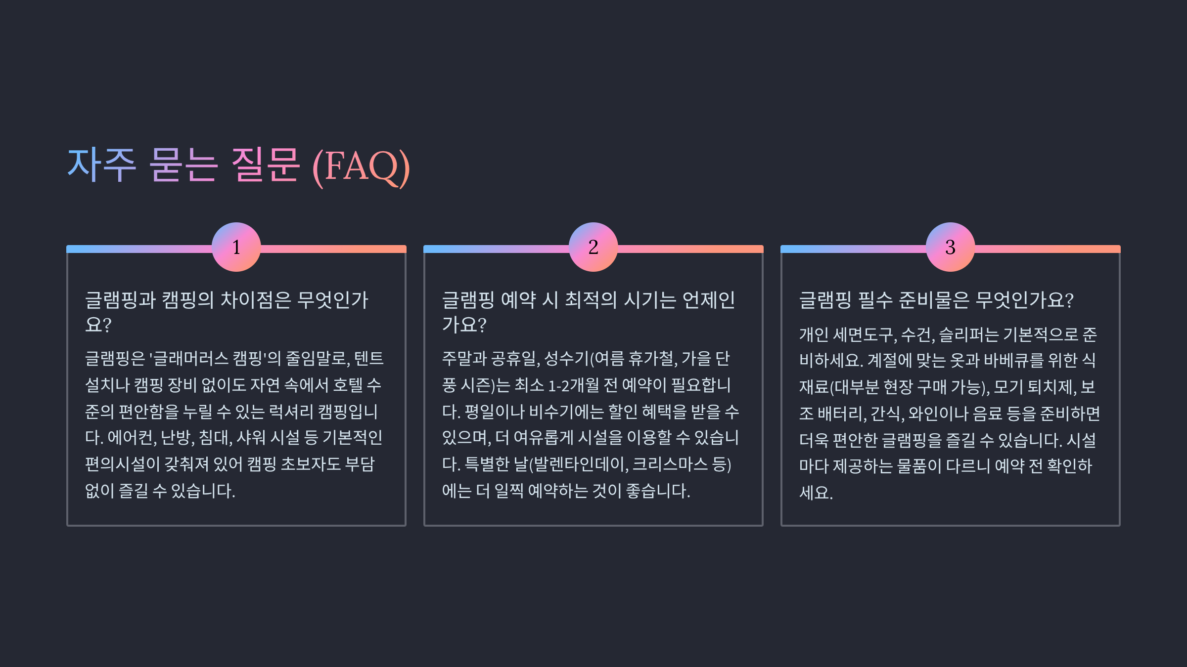 | 편의시설 완비 | 편리하고 쾌적한 숙박 | 예약 경쟁률이 높음 |