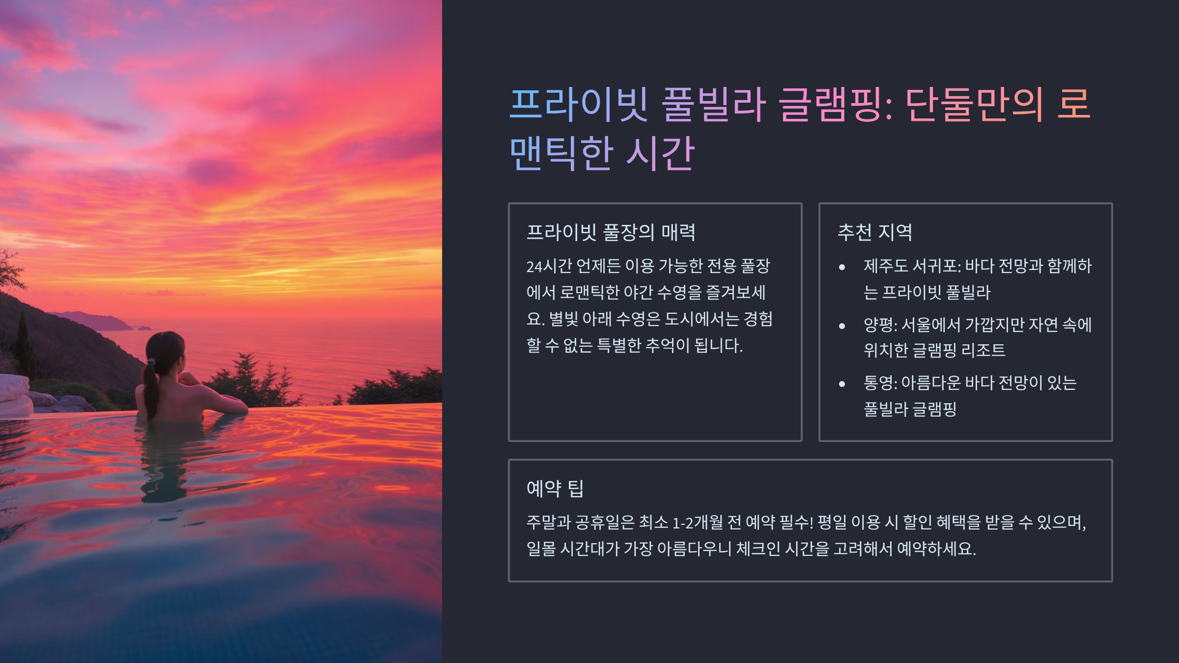 | 프라이빗 풀, 스파 | 단둘만의 오붓한 시간 보장 | 상대적으로 높은 가격대 |
