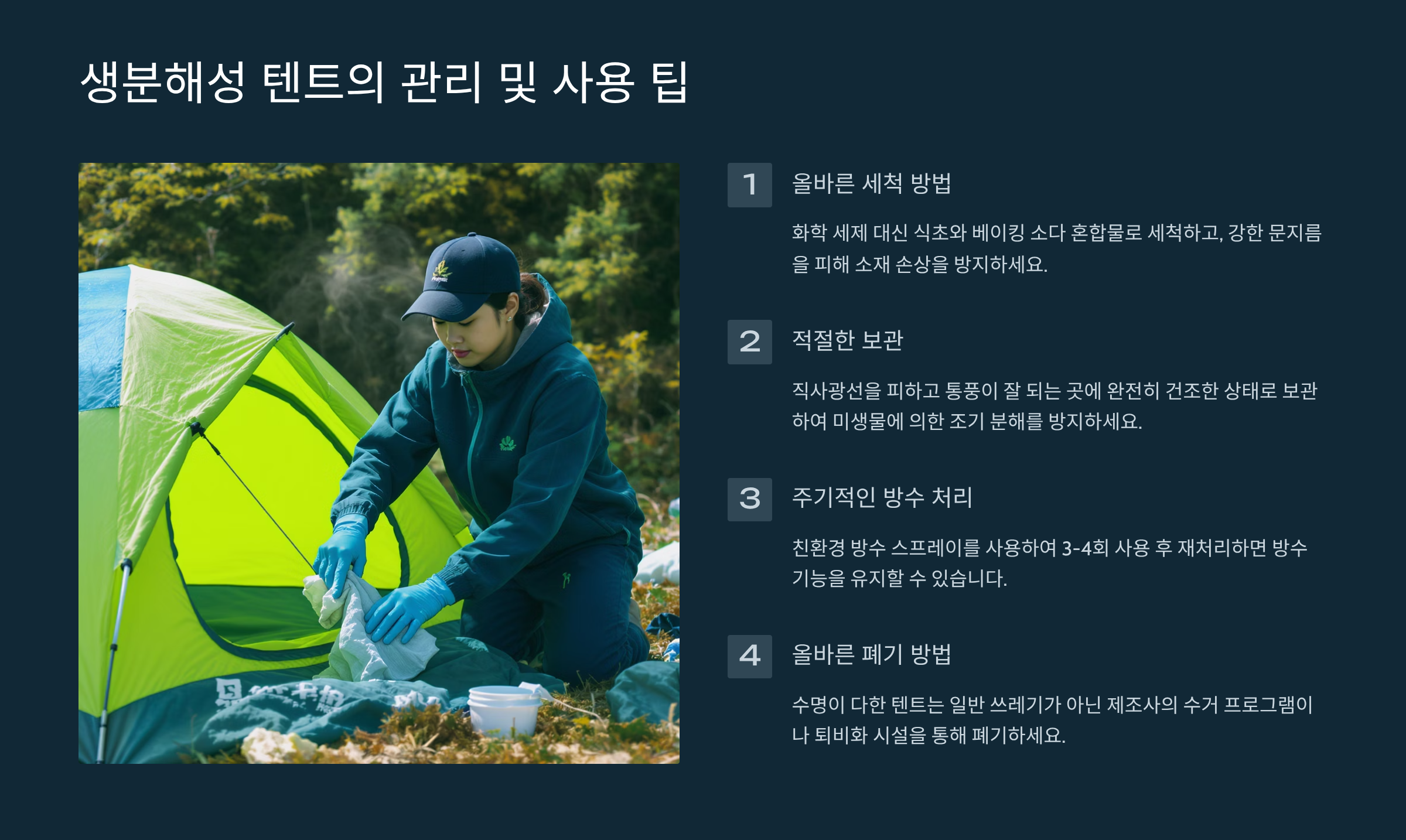 **캠핑용 생분해성 텐트**를 오래 사용하기 위해서는 올바른 관리가 필수적입니다. 생분해성 소재의 특성상 과도한 습기나 직사광선에 장시간 노출되면 수명이 단축될 수 있습니다. 텐트 사용 후에는 반드시 완전히 건조시킨 후 보관해야 곰팡이나 변형을 방지할 수 있습니다. 또한, 세척 시에는 강한 화학 세제 대신 중성 세제를 사용하고, 부드러운 천으로 닦아주는 것이 좋습니다. 텐트 보관 시에는 통풍이 잘되는 서늘하고 건조한 곳에 두는 것이 중요합니다. 혹시 텐트가 훼손되었을 경우, 기존 텐트와 마찬가지로 수선 키트를 사용하여 보수가 가능합니다. 이러한 관리를 통해 생분해성 텐트의 수명을 최대한 연장하고, 궁극적으로는 폐기 시 환경 부담을 줄이는 효과를 극대화할 수 있습니다.