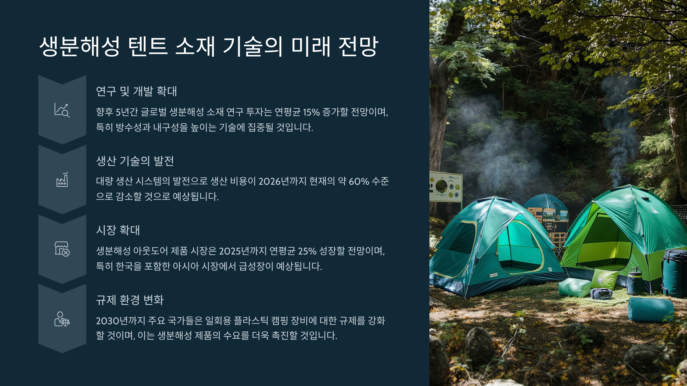 **캠핑용 생분해성 텐트 소재**는 아직 시장 초기 단계이지만, 그 성장 잠재력은 매우 높습니다. 환경 규제가 강화되고 소비자들의 인식이 변화함에 따라, 친환경 제품에 대한 수요는 계속해서 증가할 것입니다. 특히 아웃도어 브랜드들은 '지속가능성'을 중요한 마케팅 포인트로 삼고 있어, 생분해성 텐트 개발에 적극적으로 투자하고 있습니다. 앞으로는 더욱 뛰어난 내구성과 방수 성능을 갖춘 신소재들이 등장할 것으로 예상됩니다. 또한, 텐트뿐만 아니라 캠핑용 의자, 매트, 가방 등 다양한 캠핑 용품에도 생분해성 소재가 적용될 것입니다. 궁극적으로는 캠핑 용품 전체가 자연으로 돌아가는 **'완전한 생분해성 캠핑'**이 가능해질 것으로 보입니다. 이는 아웃도어 활동의 본질인 '자연과의 공존'을 실현하는 중요한 발걸음이 될 것입니다.