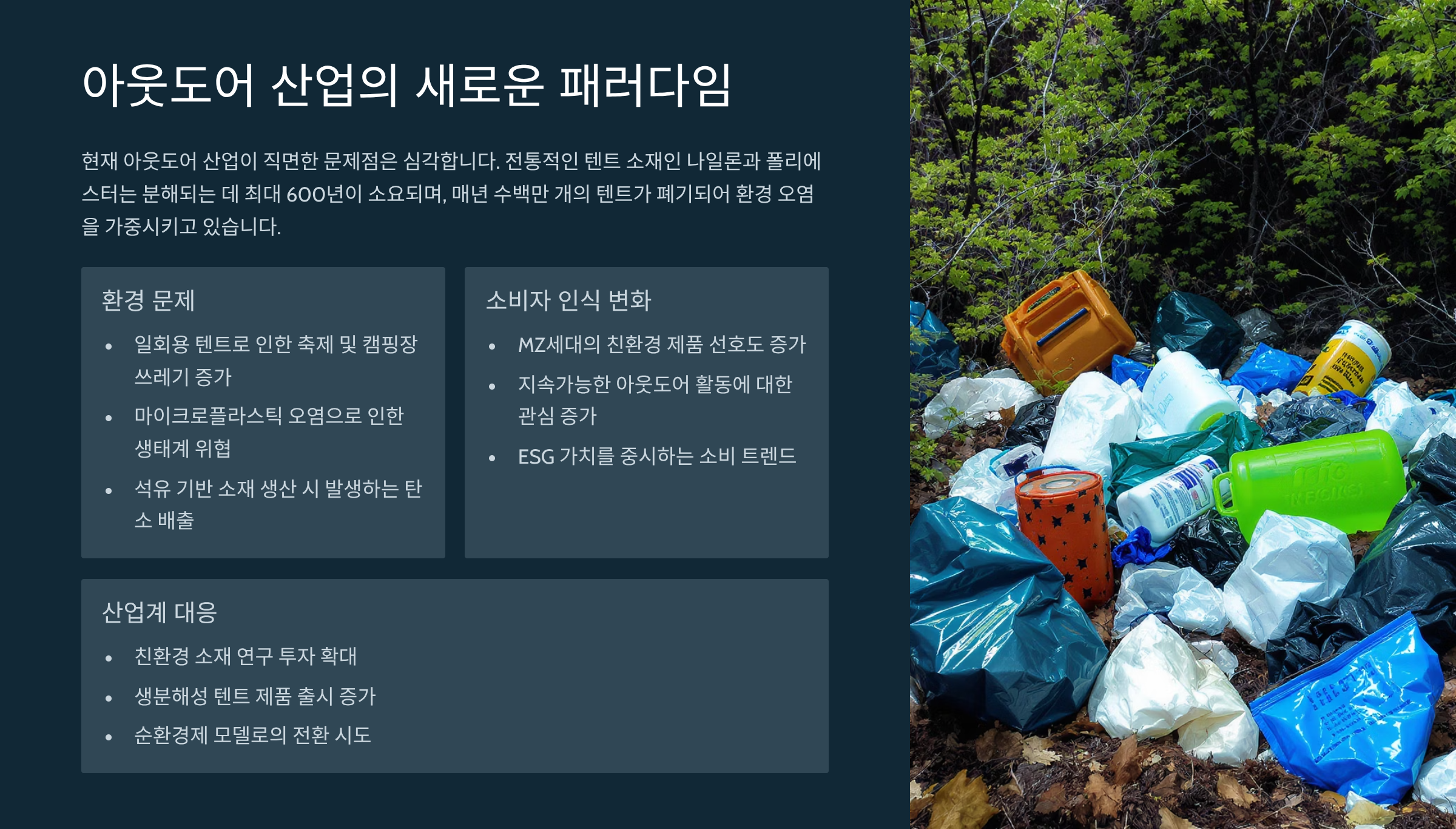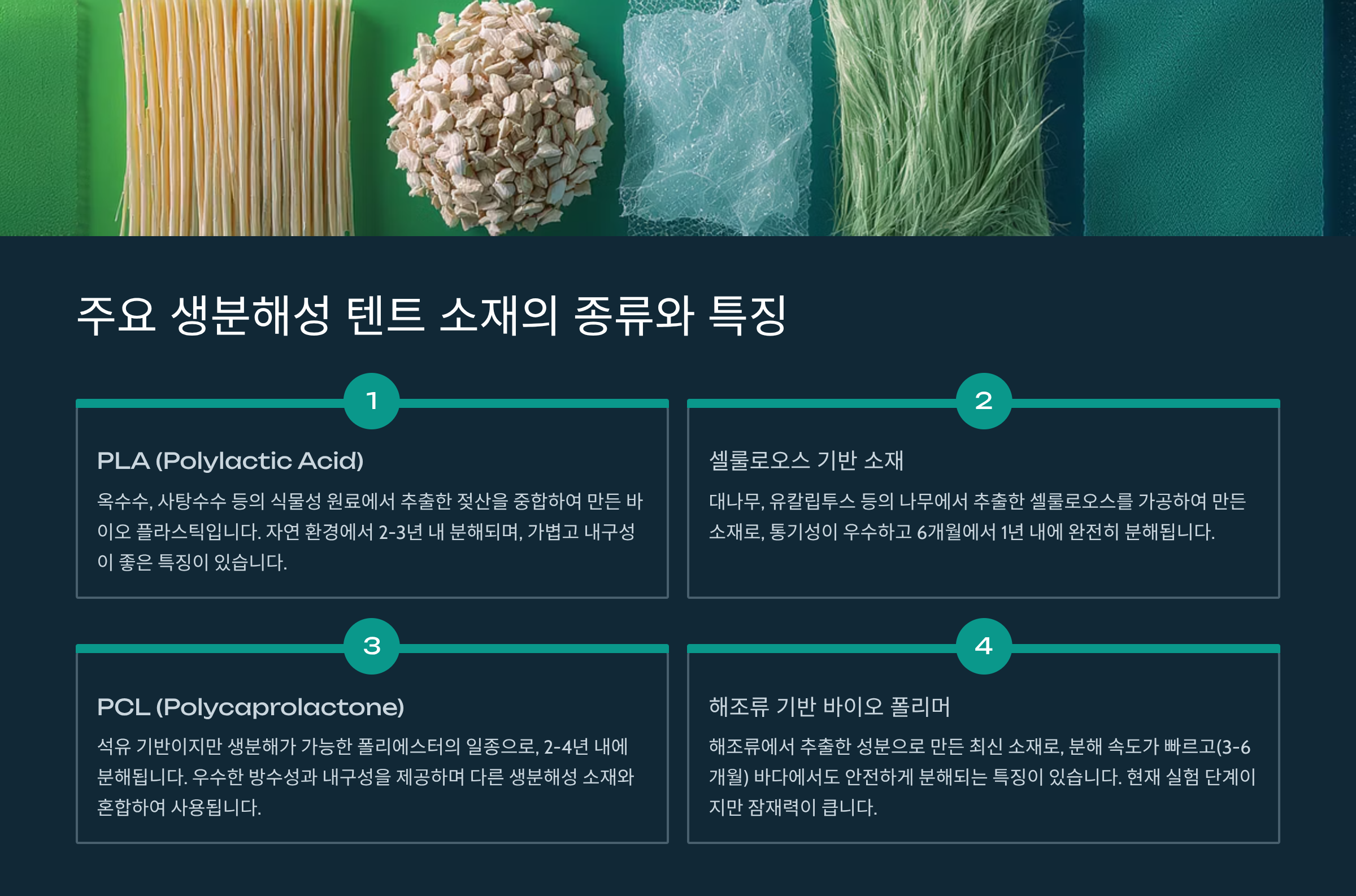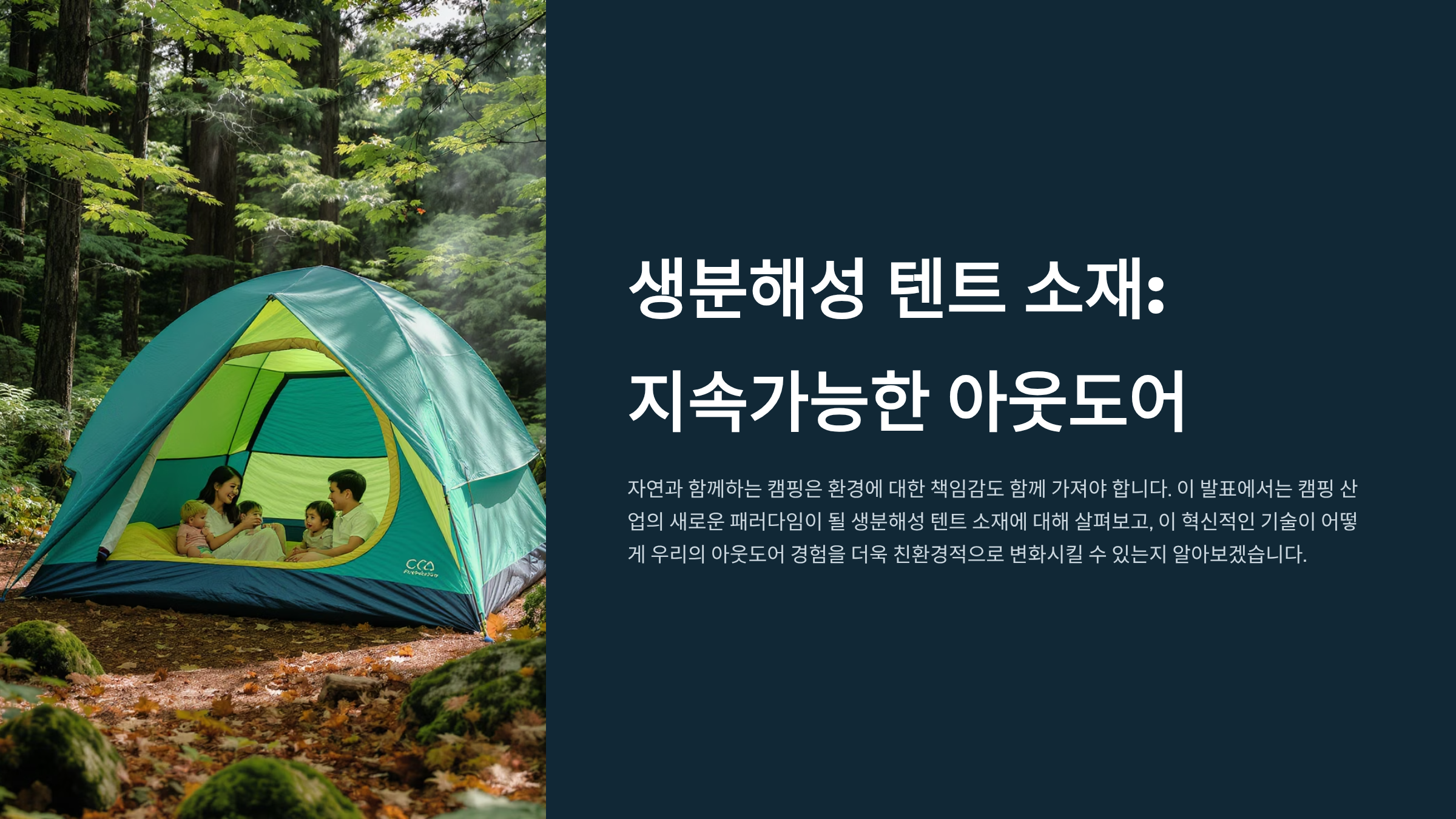 최근 환경에 대한 관심이 높아지면서, 지속가능성은 더 이상 선택이 아닌 필수적인 요소가 되었습니다. 특히 자연 속에서 즐기는 활동인 캠핑은 환경에 미치는 영향을 최소화하려는 노력이 더욱 중요하게 여겨지고 있습니다. 기존의 텐트는 대부분 폴리에스터나 나일론 같은 합성 섬유로 만들어져 폐기 시 자연 분해되지 않고 환경 오염의 주범이 됩니다. 이러한 문제를 해결하기 위해 등장한 것이 바로 **캠핑용 생분해성 텐트 소재**입니다. 이 소재는 사용 후 자연으로 돌아가 환경 부담을 줄이는 혁신적인 해결책으로 주목받고 있습니다.