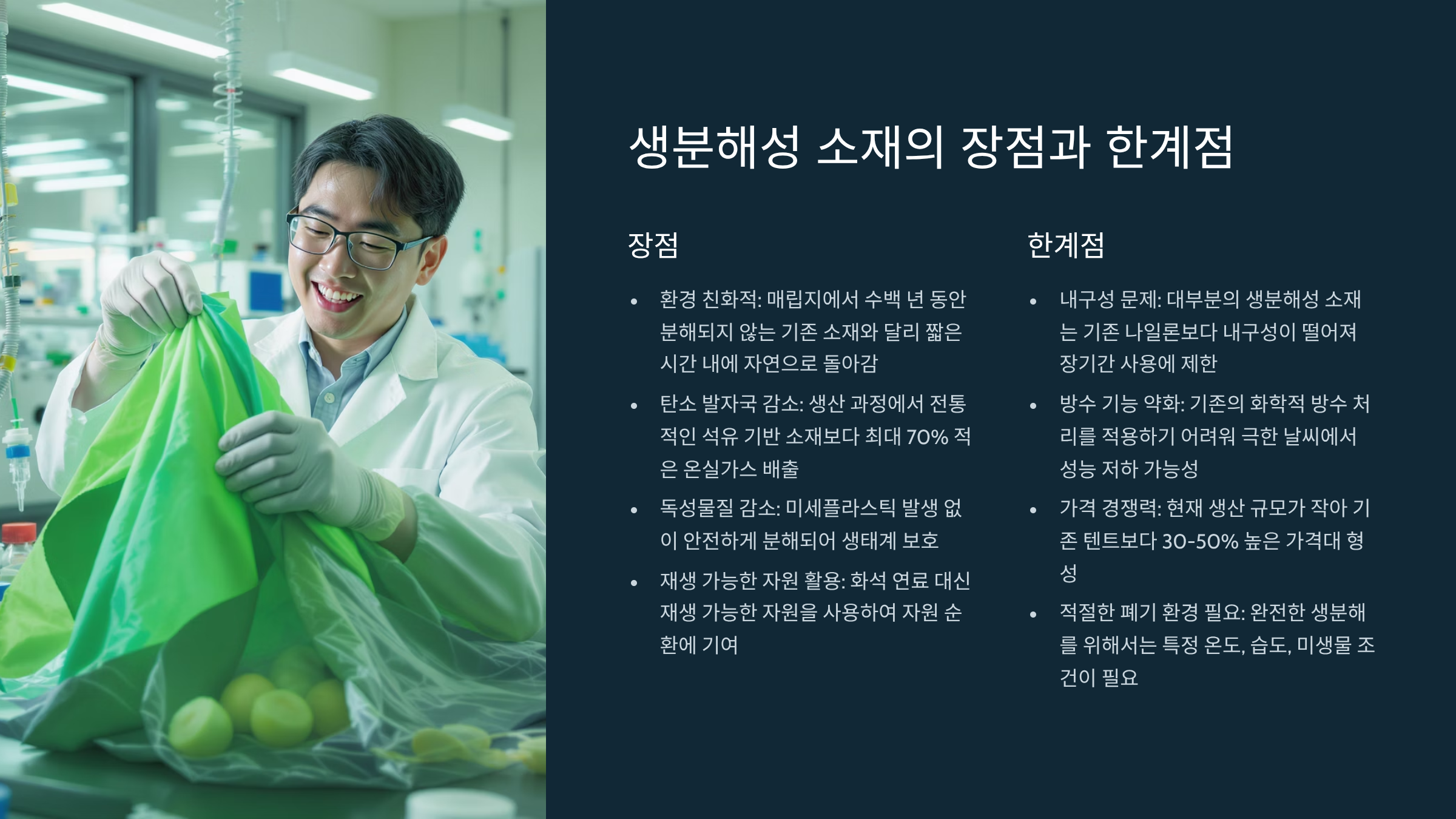 **캠핑용 생분해성 텐트 소재**는 명확한 장점과 아직 해결해야 할 과제를 모두 가지고 있습니다. 가장 큰 장점은 물론 **환경 보호**입니다. 기존의 플라스틱 텐트와 달리, 사용 후 올바르게 폐기하면 자연에서 미생물에 의해 물과 이산화탄소로 분해되어 환경 오염을 최소화할 수 있습니다. 또한, 바이오 소재를 사용함으로써 석유 기반의 자원 사용을 줄일 수 있습니다. 하지만 아직 몇 가지 한계점도 존재합니다. 첫째, **내구성과 방수 기능**입니다. 기존 텐트에 비해 강도나 방수 성능이 떨어질 수 있어, 이를 보완하기 위한 기술 개발이 지속적으로 이루어지고 있습니다. 둘째, **가격 경쟁력**입니다. 아직은 생산 단가가 높아 일반적인 텐트에 비해 가격이 비싼 편입니다. 셋째, **폐기 조건**입니다. 모든 생분해성 소재가 모든 환경에서 쉽게 분해되는 것은 아니며, 특정 조건(온도, 습도 등)을 필요로 하는 경우가 많습니다. 이러한 한계점들을 극복하기 위한 노력이 계속되고 있습니다.