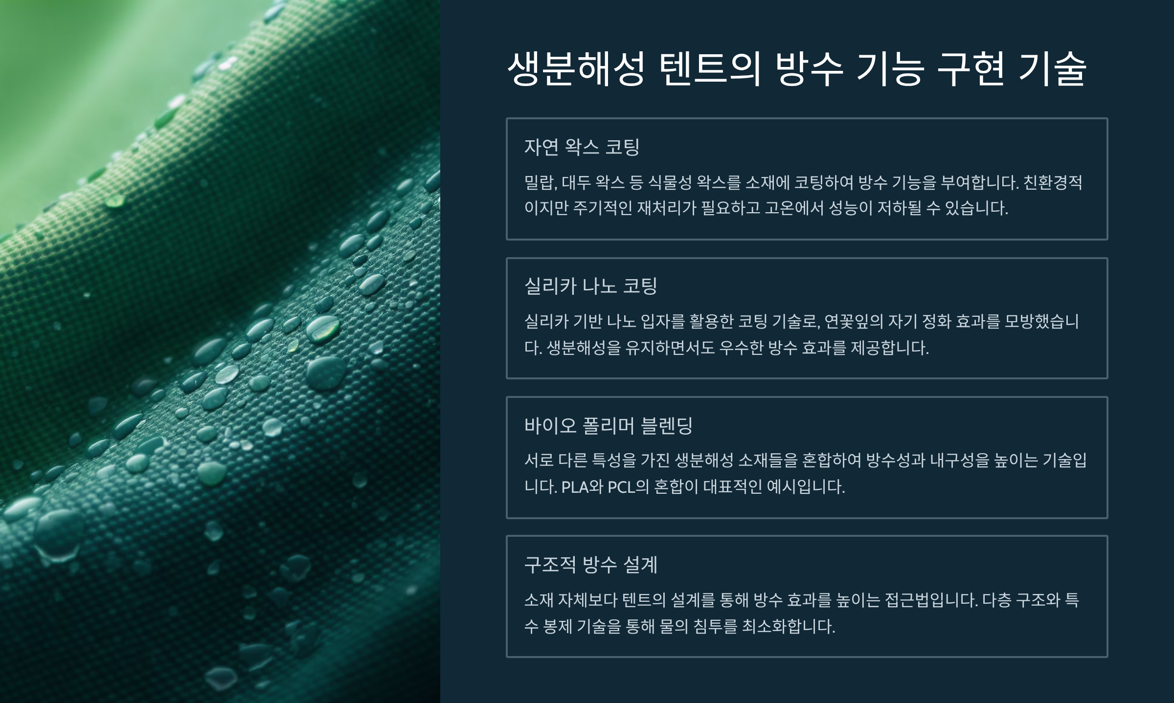 텐트에서 방수 기능은 가장 중요한 요소 중 하나입니다. 기존의 텐트는 대부분 석유 기반의 PU(폴리우레탄) 코팅을 통해 방수 기능을 확보했습니다. 하지만 이러한 코팅제는 생분해되지 않아 친환경이라는 가치를 훼손합니다. **캠핑용 생분해성 텐트**는 이 문제를 해결하기 위해 다양한 방수 기술을 개발하고 있습니다. 대표적으로는 옥수수 전분이나 식물성 오일 기반의 **바이오 코팅제**를 사용합니다. 이 코팅제는 자연 분해되면서도 우수한 방수 성능을 제공합니다. 또한, 섬유 자체의 구조를 개선하여 발수성을 높이는 기술도 연구 중입니다. 예를 들어, 물방울이 섬유 표면에 스며들지 않고 흘러내리도록 특수 가공하는 방식입니다. 이러한 기술들은 생분해성 소재의 단점을 보완하며, 기존 텐트와 유사한 성능을 제공하기 위해 계속해서 발전하고 있습니다.