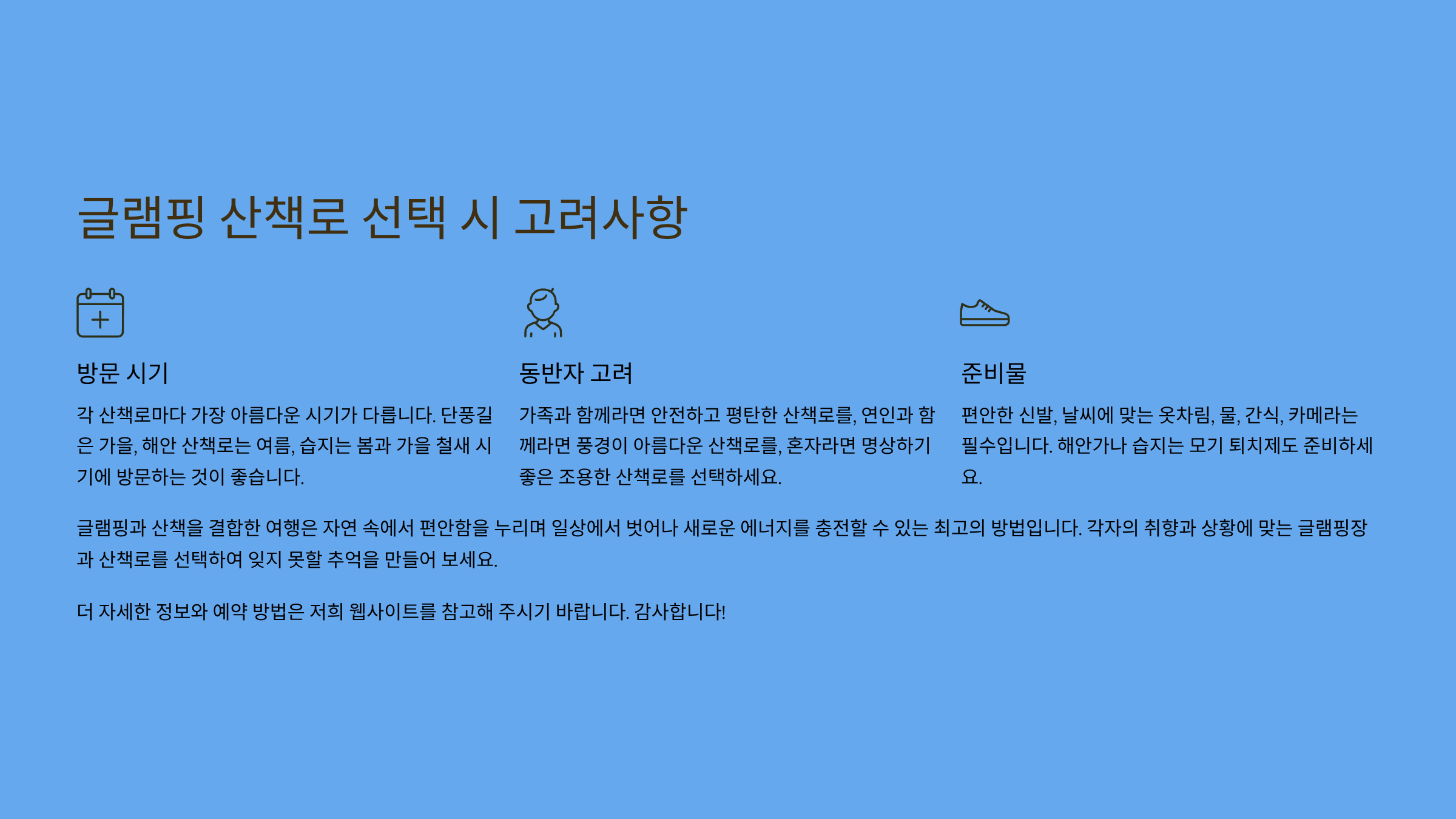 | 글램핑장 | 산책로 특징 | 추천 경험 |