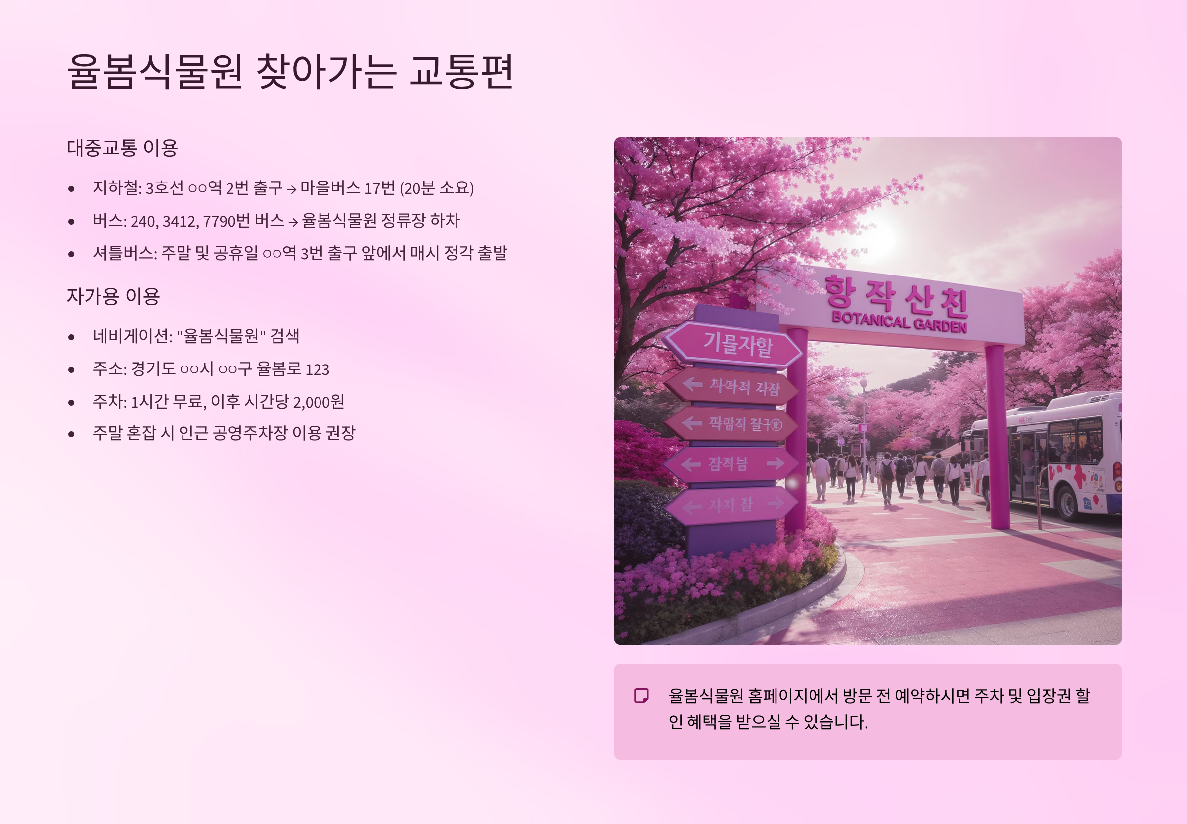 | 자가용 | 내비게이션에 '율봄식물원' 검색 | 주말엔 오전 일찍 방문 추천 |