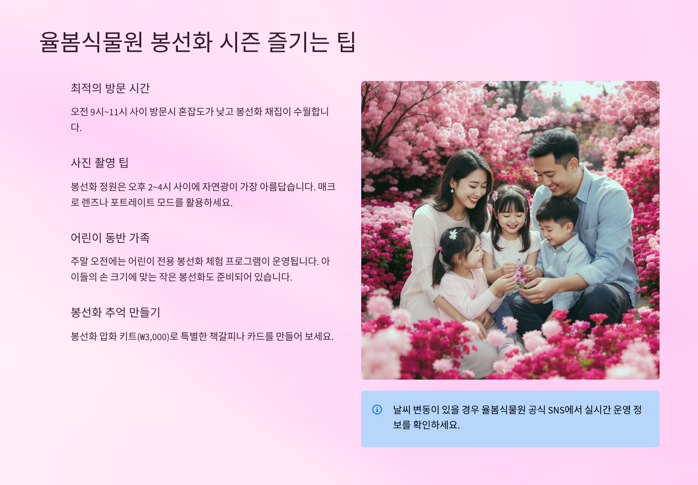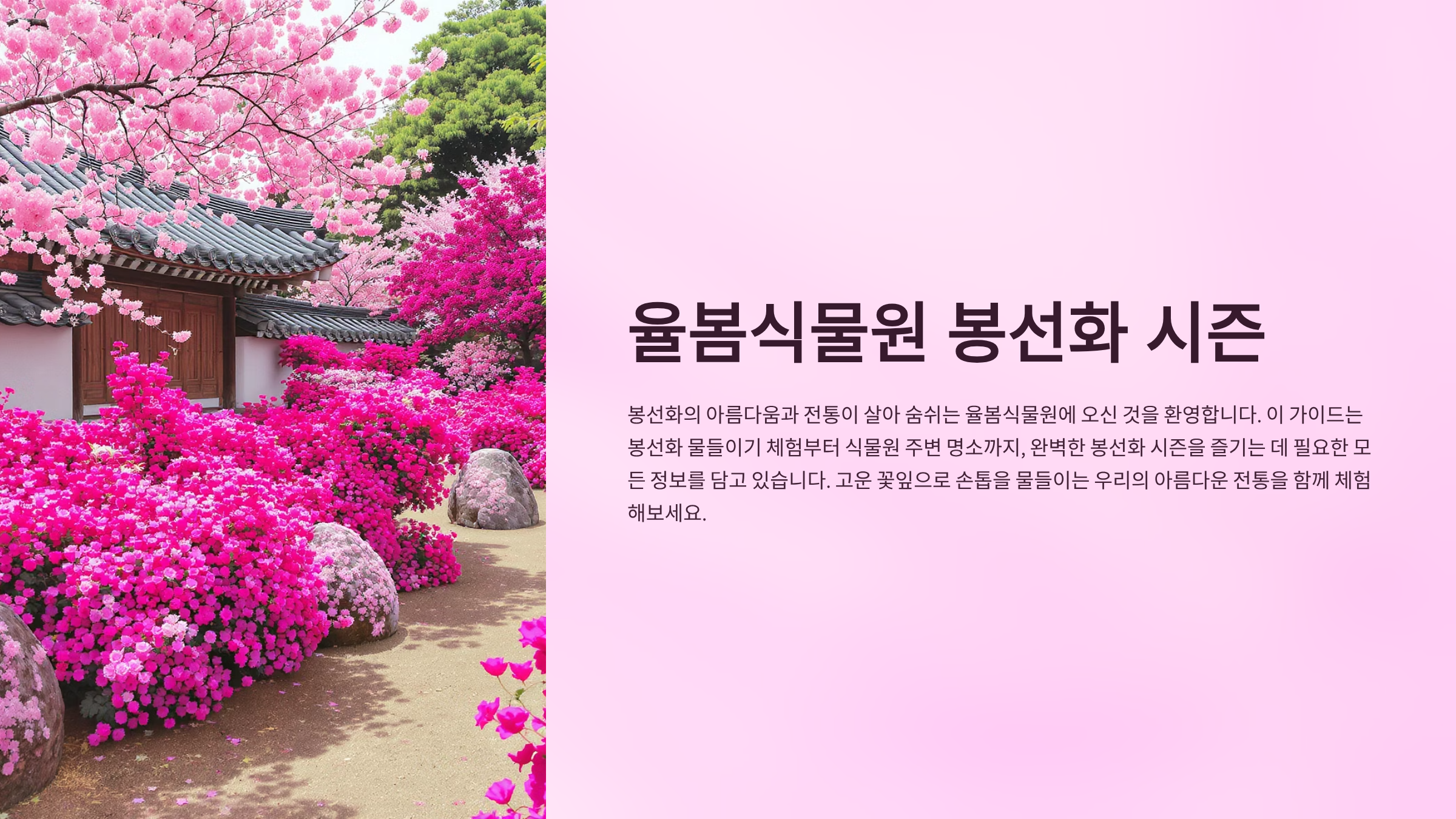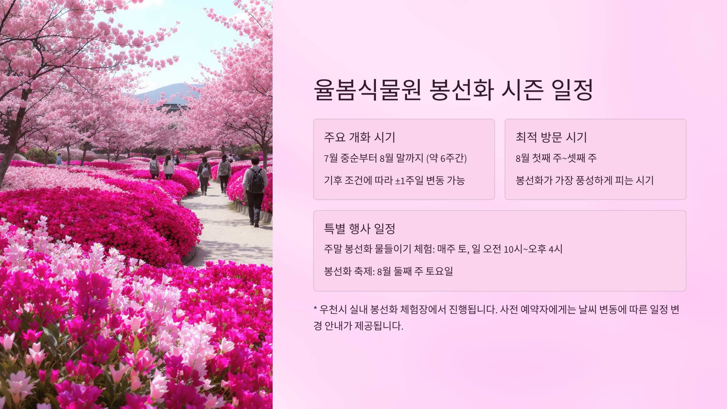 면책 조항: 본 글은 정보 제공 목적으로 작성되었으며, 봉선화 시즌, 체험 비용, 운영 시간 등은 추정치이므로, 방문 전 율봄식물원 공식 홈페이지를 통해 정확한 정보를 확인하시기 바랍니다. 내용이 변동될 수 있으며, 최종 확인의 책임은 이용자 본인에게 있습니다.