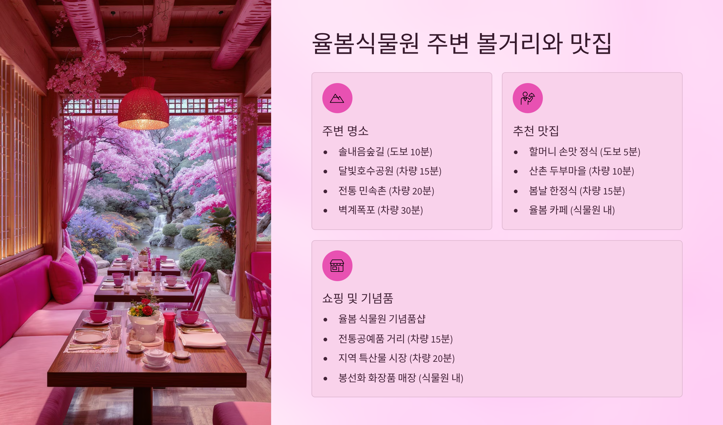 율봄식물원 방문 전후로 즐길 수 있는 주변 볼거리와 맛집 정보를 미리 알아두면 더욱 알찬 여행을 계획할 수 있습니다. 율봄식물원은 경기도 광주에 위치하고 있어, 남한산성, 화담숲 등 유명 관광지와 인접해 있습니다. 봉선화 시즌이 아니더라도 화담숲의 다양한 식물들을 함께 감상할 수 있어 연계 코스로 추천합니다. 또한 광주시는 맛집이 많은 지역으로, 율봄식물원 주변에는 한정식, 닭백숙 등 건강한 먹거리를 즐길 수 있는 식당들이 많습니다. 방문 전 인터넷 검색이나 맛집 어플을 통해 미리 예약하거나 정보를 확인하는 것이 좋습니다. 특히 주말에는 인파가 많으므로, 여유로운 식사를 위해 미리 계획하는 것을 추천합니다.