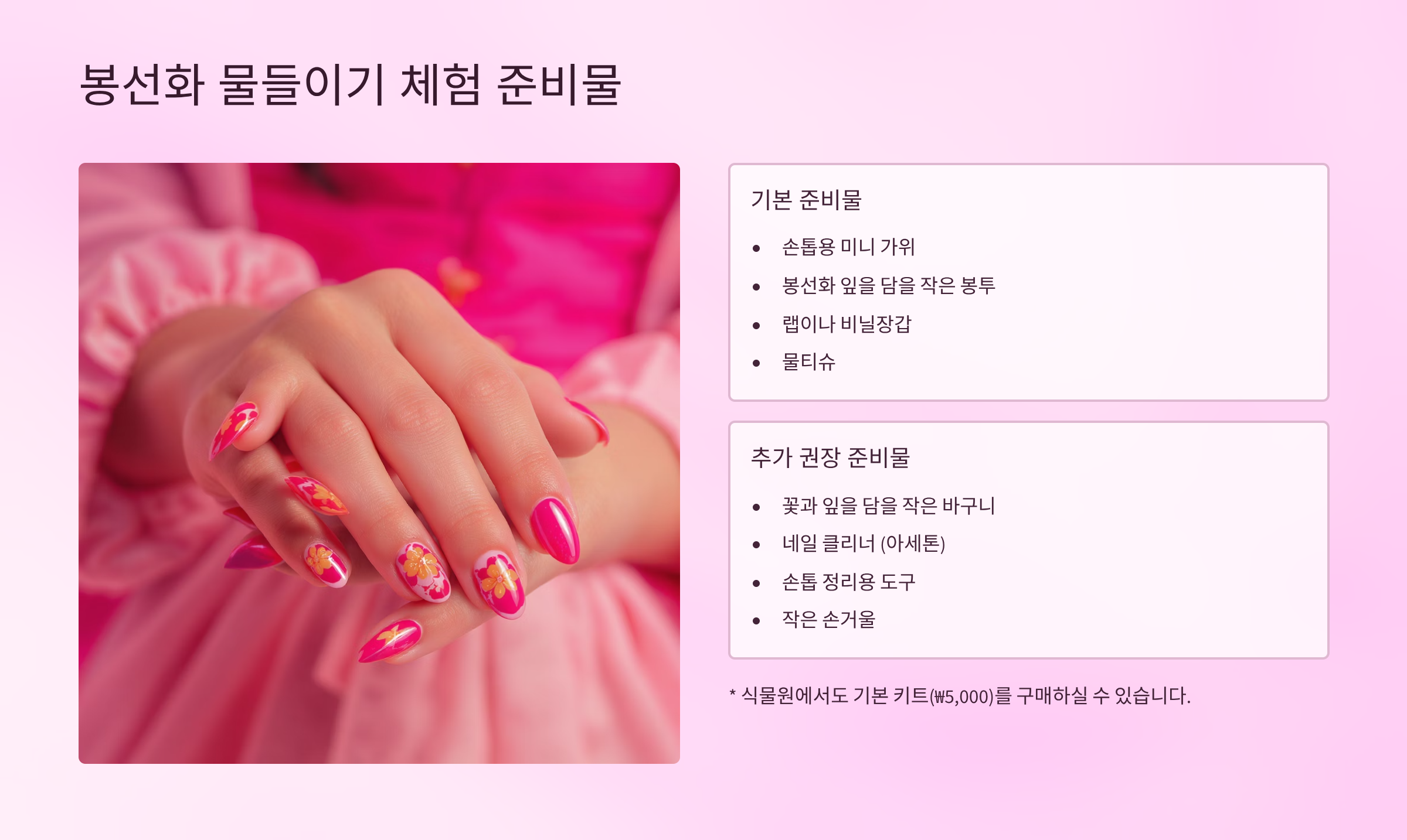 율봄식물원에서는 봉선화 물들이기 체험 키트를 판매하거나 프로그램을 운영하고 있어 별다른 준비물 없이 방문해도 체험이 가능합니다. 하지만 직접 준비물을 챙겨가면 더 풍성하게 즐길 수 있습니다. 기본적으로 봉선화 잎, 백반(명반) 가루, 그리고 찧을 도구가 필요합니다. 잎과 백반을 잘 섞어 찧은 후 손톱에 올리고 비닐이나 봉숭아 잎으로 잘 감싸 실로 묶어 고정하면 됩니다. 찧는 도구로는 작은 절구나 돌멩이, 위생 비닐 등이 유용합니다. 또한, 손톱에 물을 들인 후 감싸줄 비닐과 붕대, 실 등을 추가로 챙기면 더욱 편리합니다. 이외에 체험 후 손을 씻을 물티슈나 손 소독제를 챙기는 것도 좋은 팁입니다.