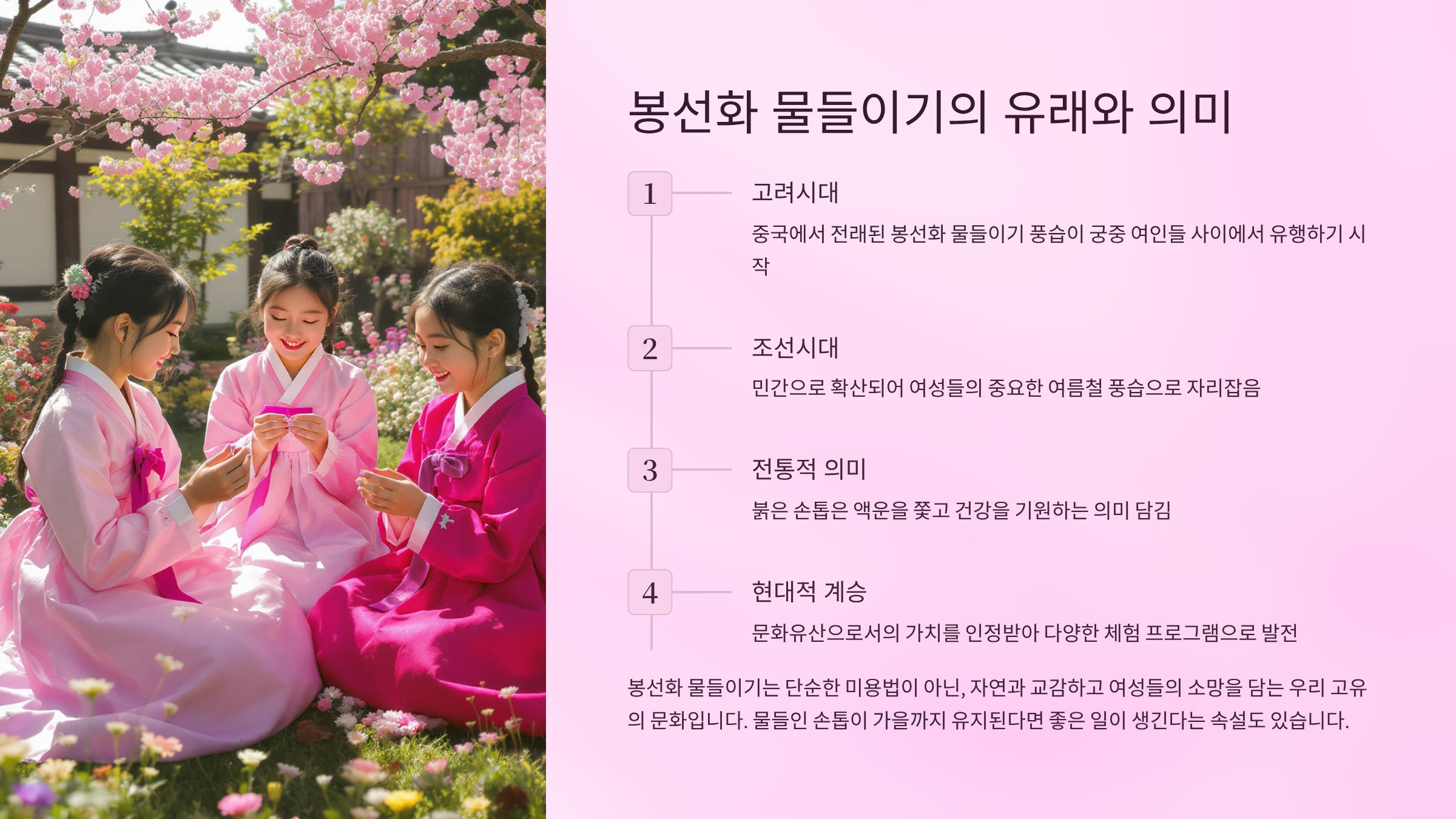 내가 생각했을 때, 율봄식물원의 봉선화 시즌은 단순히 꽃을 감상하는 것을 넘어, 자연 속에서 잊고 지냈던 전통 놀이를 즐기며 온전한 힐링을 할 수 있는 기회를 제공합니다. 봉선화 물들이기는 예로부터 전해져 내려온 아름다운 문화로, 가족이나 연인과 함께 손톱을 물들이며 소중한 추억을 쌓는 과정 자체가 의미 있는 시간이 됩니다. 특히 율봄식물원은 잘 가꿔진 봉선화 꽃밭과 체험 공간이 마련되어 있어 더욱 편리하게 즐길 수 있습니다.