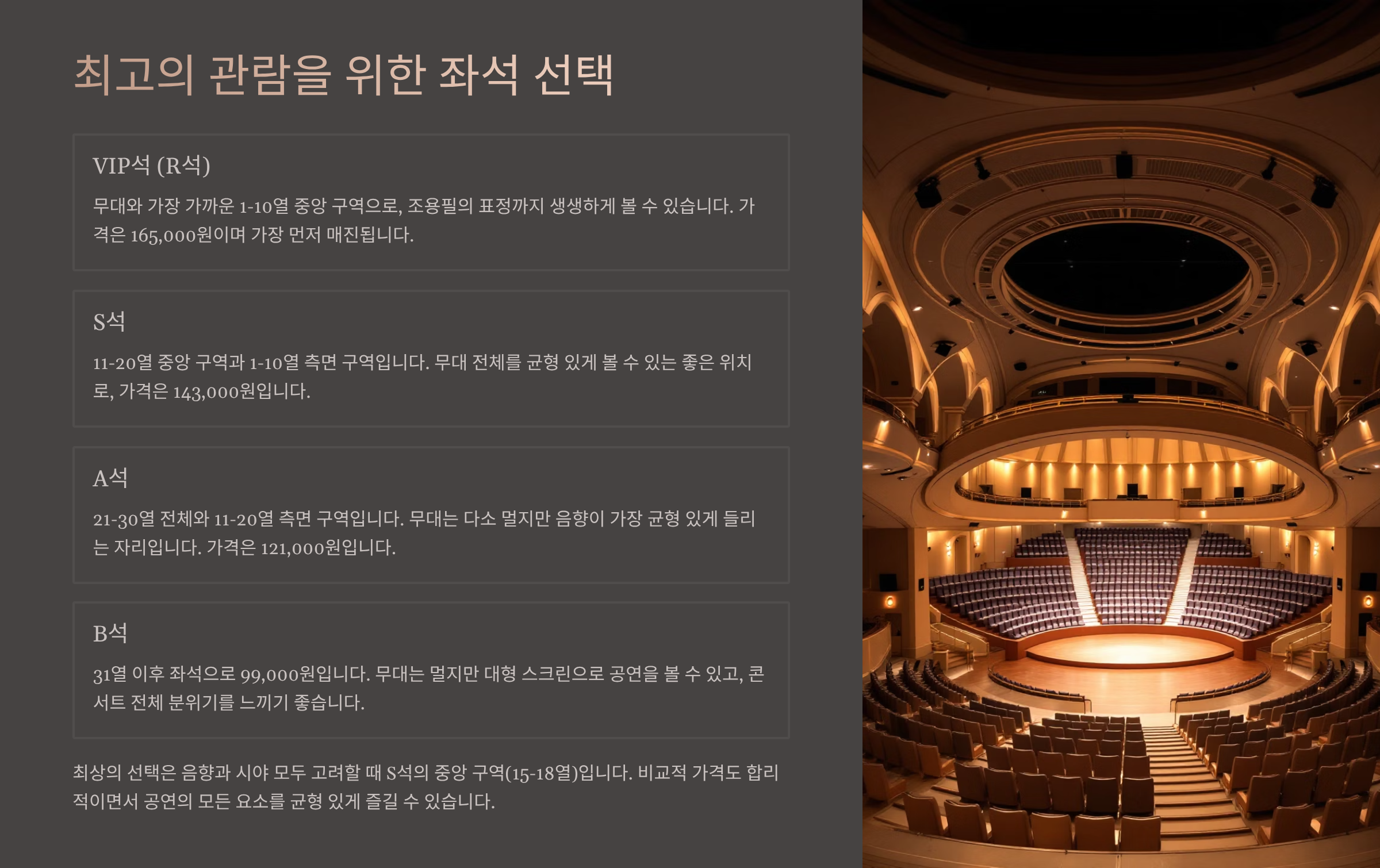 | 1층 중블록 | 최고의 시야와 음향, 가까운 거리감 |