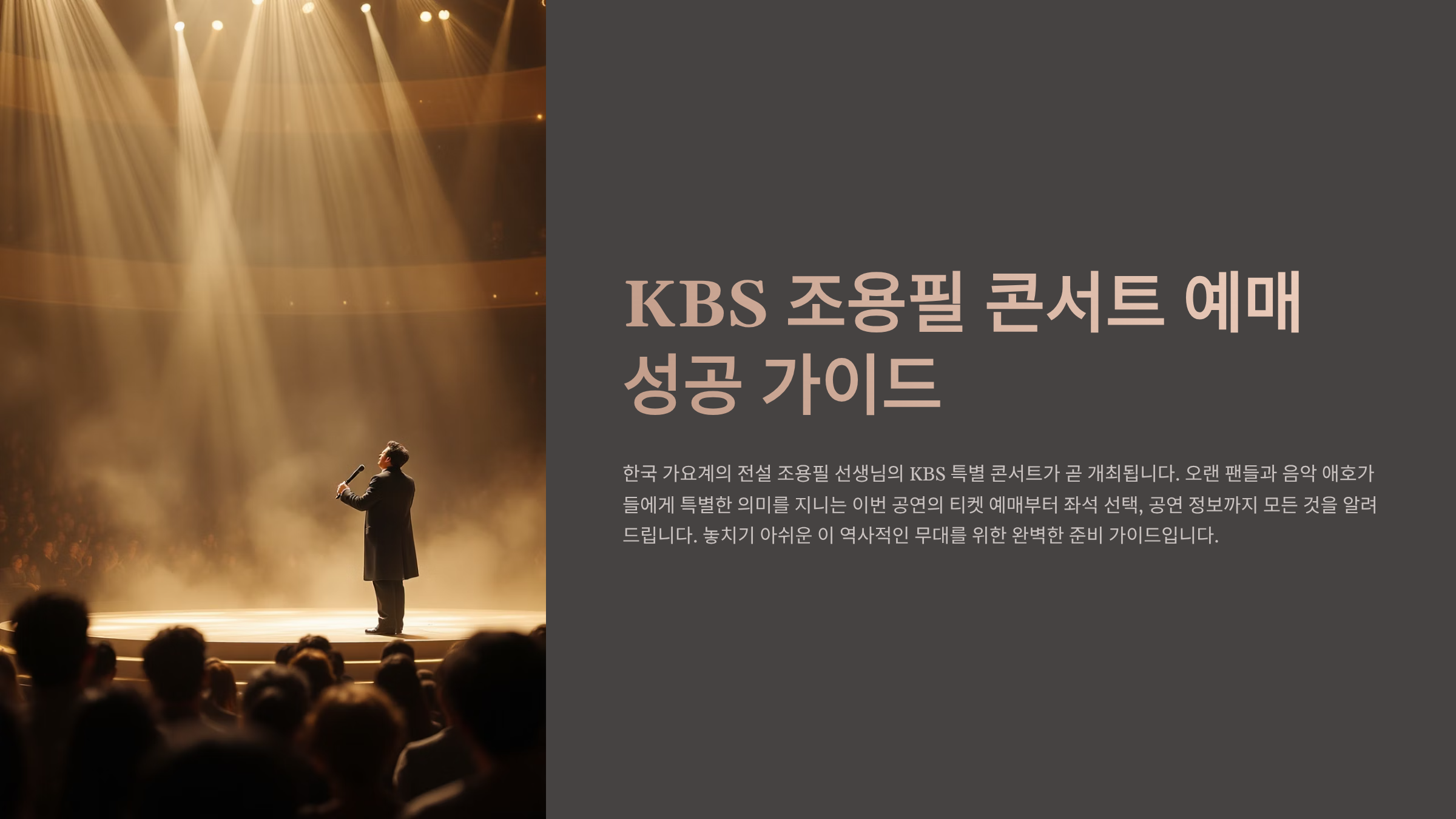 '가왕' 조용필의 음악은 세대를 넘어 모두의 마음을 울리는 힘이 있습니다. 그의 특별한 무대가 KBS를 통해 방송될 때마다, 그 열기는 시청률과 화제성으로 증명됩니다. 특히 KBS에서 주최하는 조용필 콘서트는 일반 콘서트와는 다른 특별한 의미를 가집니다. 방송을 목적으로 기획되는 만큼, 더 섬세한 음향과 무대 연출, 그리고 다양한 카메라 워킹을 통해 시청자들에게도 생생한 감동을 전달하죠. 이 글은 KBS 조용필 콘서트를 현장에서 직접 관람하고 싶은 팬들을 위해 티켓 예매 방법부터 좌석 선택 팁, 그리고 공연 관람 후 방송 시청 정보까지 모든 것을 담았습니다.