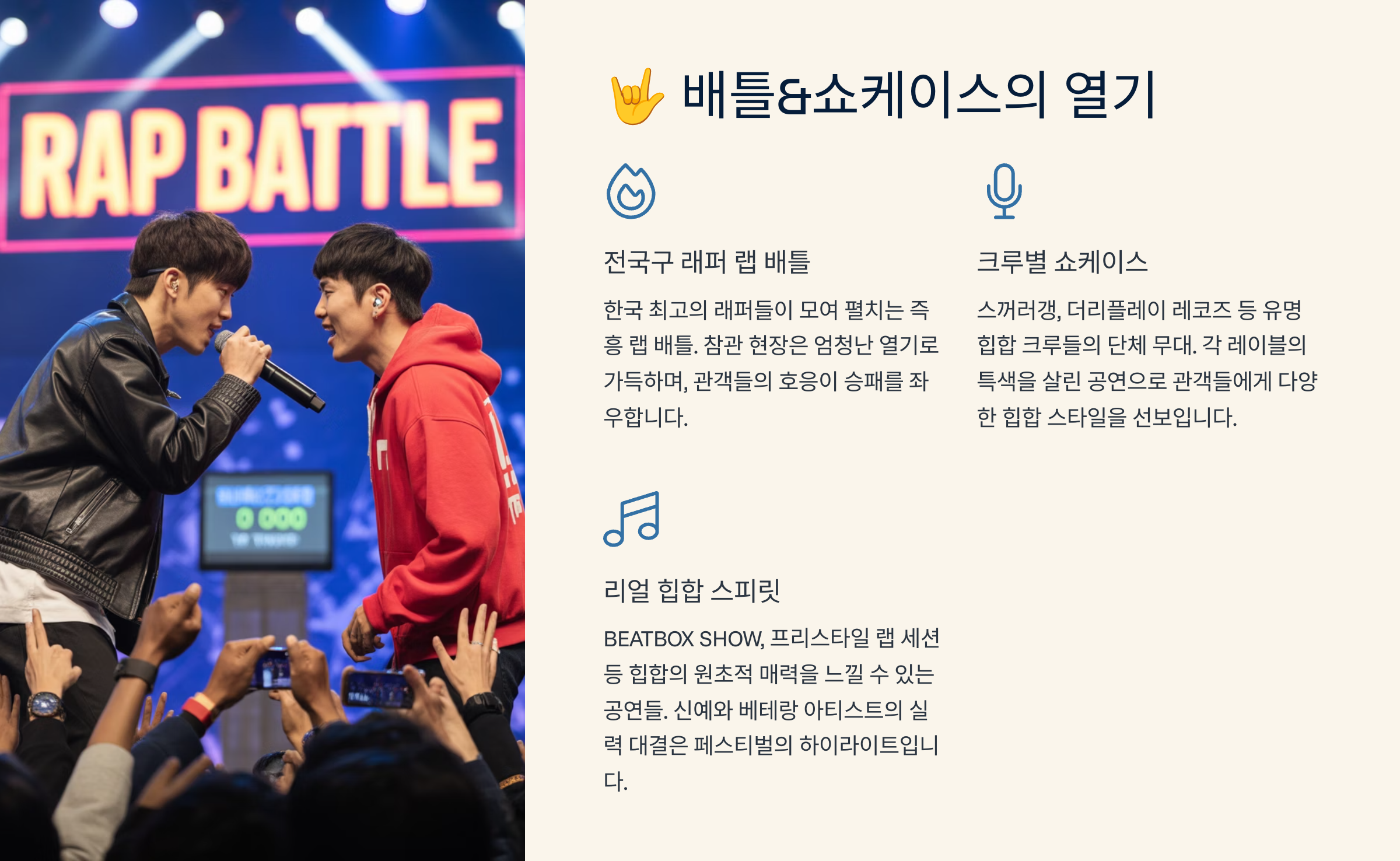 | 배틀존 | 1:1 랩배틀, 비보이 배틀, 현장 투표 |