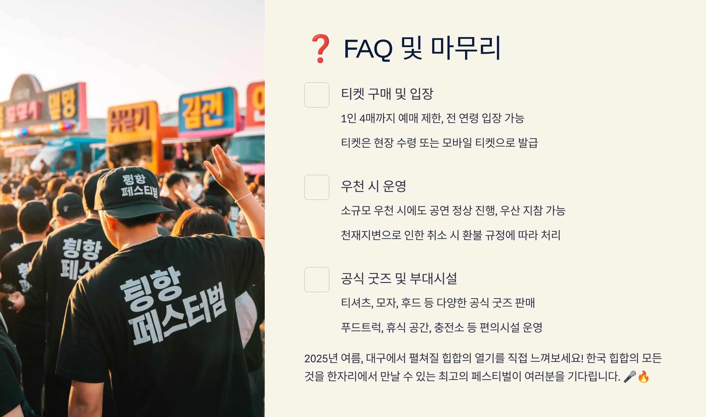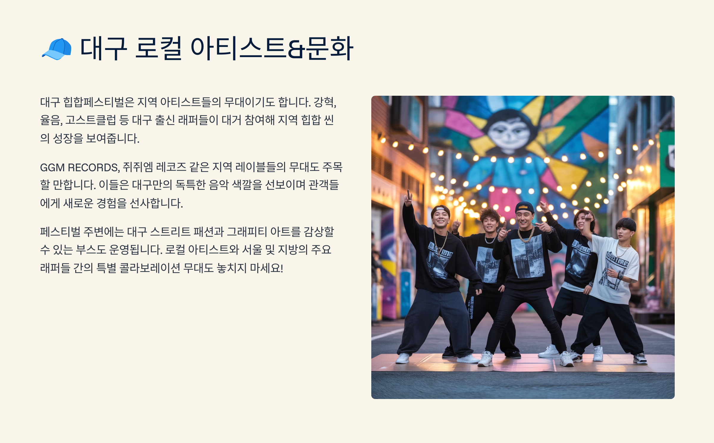 이제부터 대구 힙합페스티벌의 모든 것을 완벽하게 소개해 드릴게요. 각 섹션별로 자세히 안내할 테니, 아래에서 자동 출력되는 모든 정보를 하나도 놓치지 말고 꼭 확인해 주세요!👇