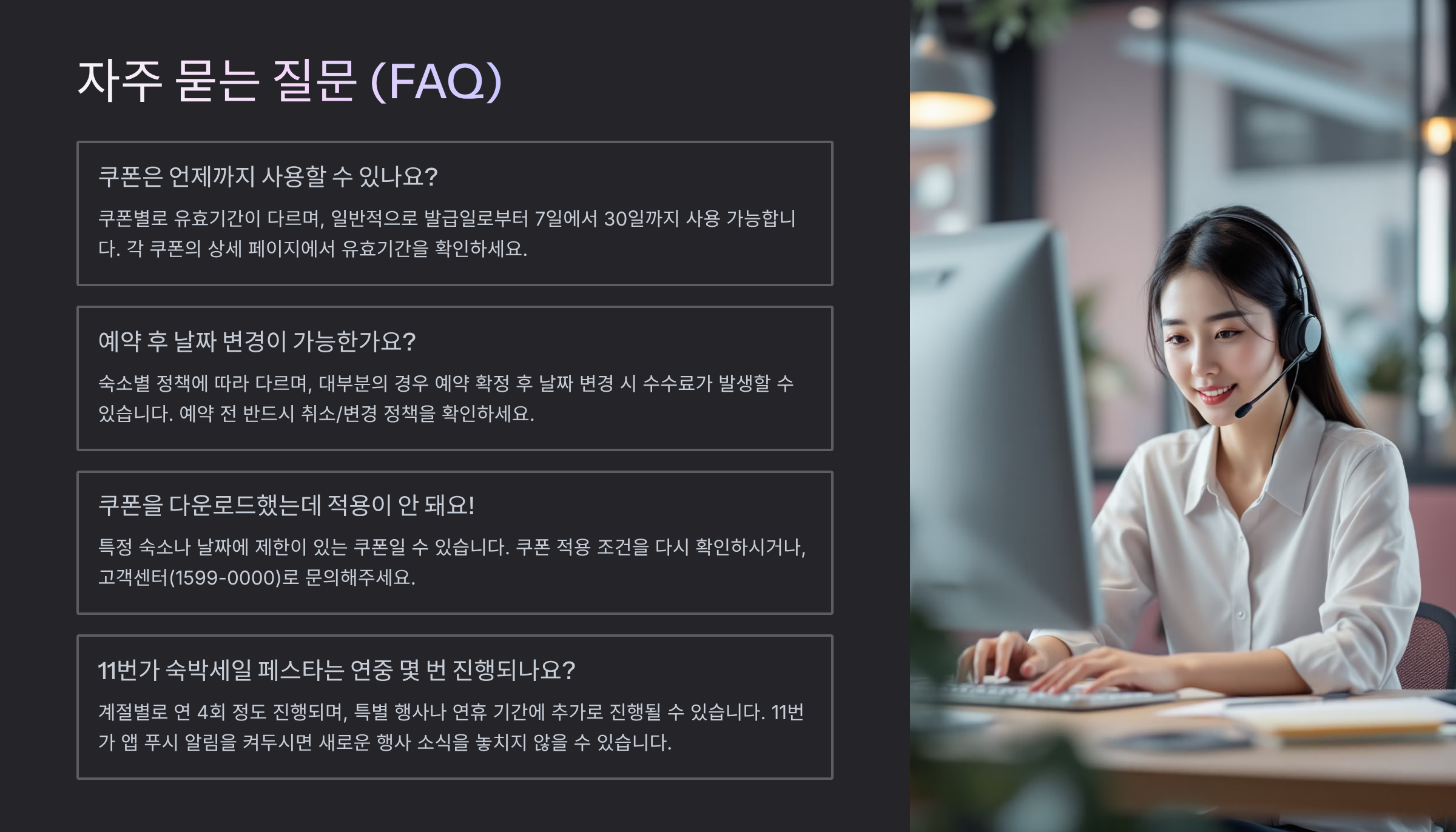 본 글은 한국관광공사와 11번가 공식 행사 페이지의 정보를 기반으로 작성되었습니다. 할인 쿠폰의 세부 조건이나 참여 숙소 목록은 변동될 수 있으므로, 최종 결제 전 반드시 공식 페이지에서 최신 정보를 확인하는 것이 필수적입니다. 이 글을 통해 숙박세일 페스타를 100% 활용하여 만족스러운 국내 여행을 계획하시길 바랍니다.