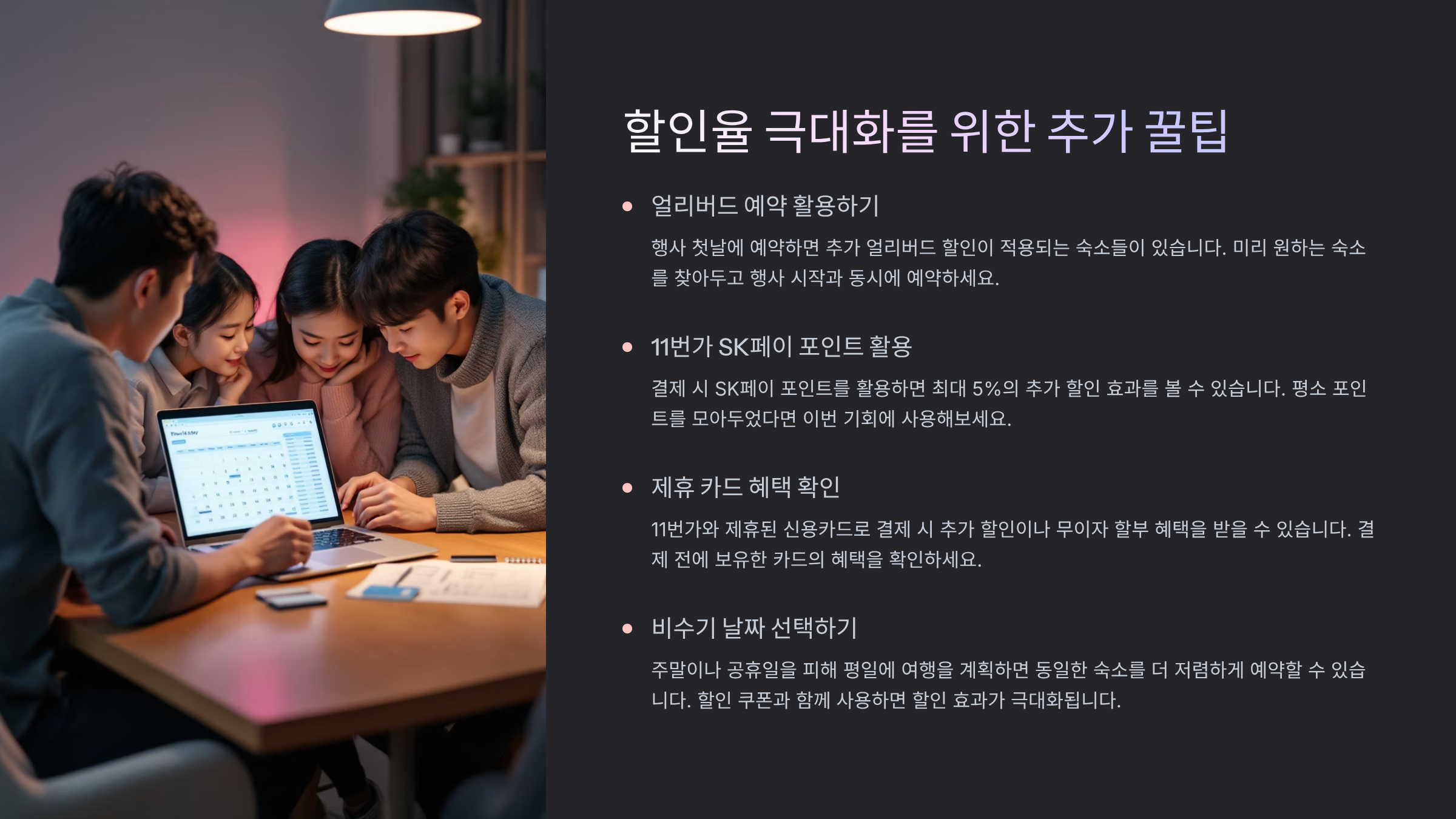 숙박세일 페스타 쿠폰을 단순히 사용하는 것을 넘어, 할인율을 극대화할 수 있는 몇 가지 꿀팁이 있습니다. 첫째, **추가 카드사 할인 혜택**을 활용하세요. 11번가는 특정 카드사와 제휴하여 추가 할인이나 청구 할인 혜택을 제공하는 경우가 많습니다. 숙박세일 페스타와 별개로 진행되는 카드사 프로모션이 있는지 확인하고, 해당 카드로 결제하면 이중 할인을 받을 수 있습니다. 둘째, **11번가 포인트나 마일리지**를 사용하세요. 쿠폰을 적용한 후 남은 금액을 포인트로 결제하면 실질적인 비용을 더 줄일 수 있습니다.