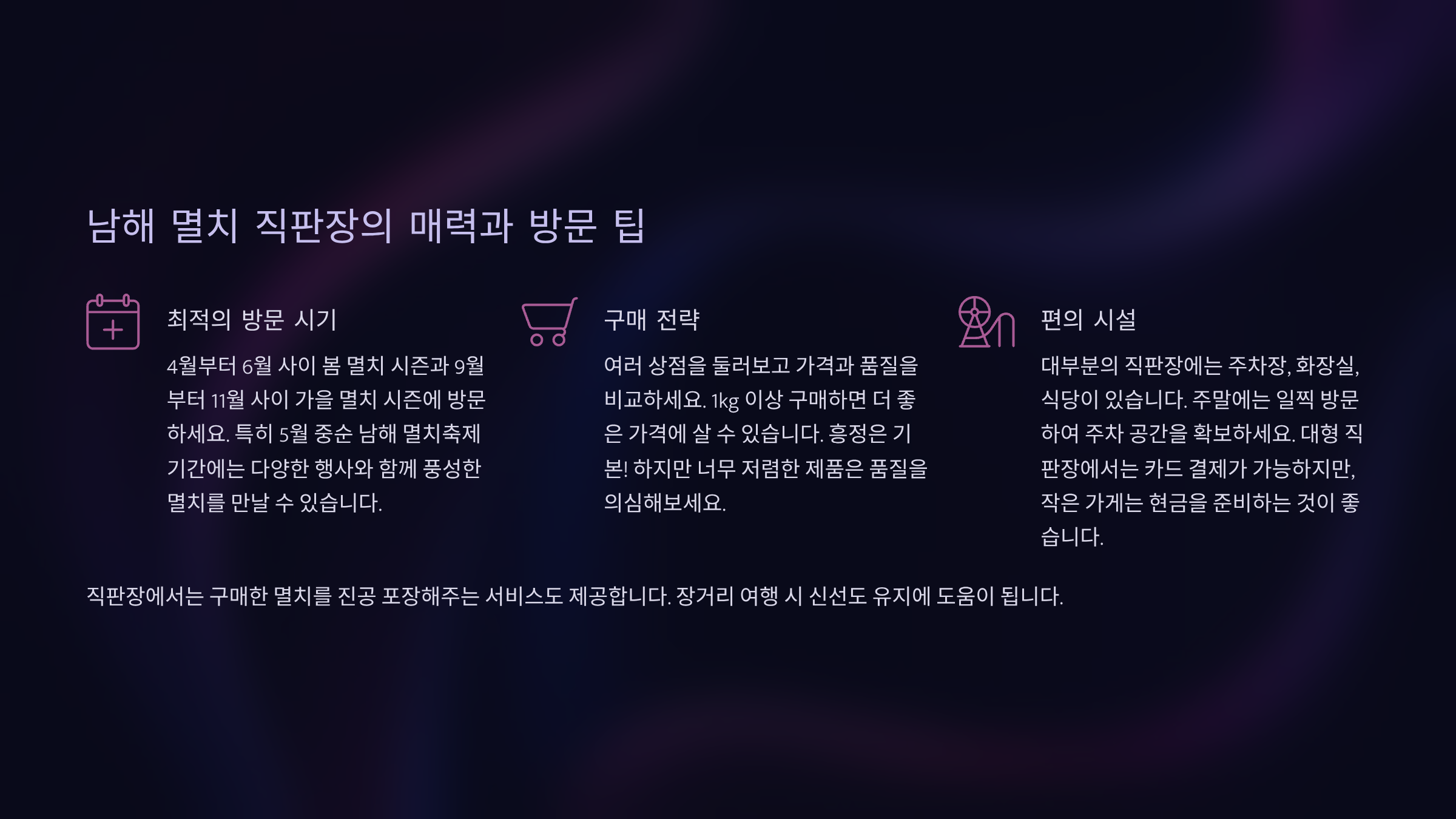 | 방문 시간 | 오전 일찍 방문하여 갓 잡은 신선한 멸치 확인 |